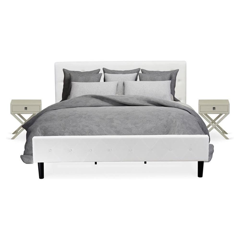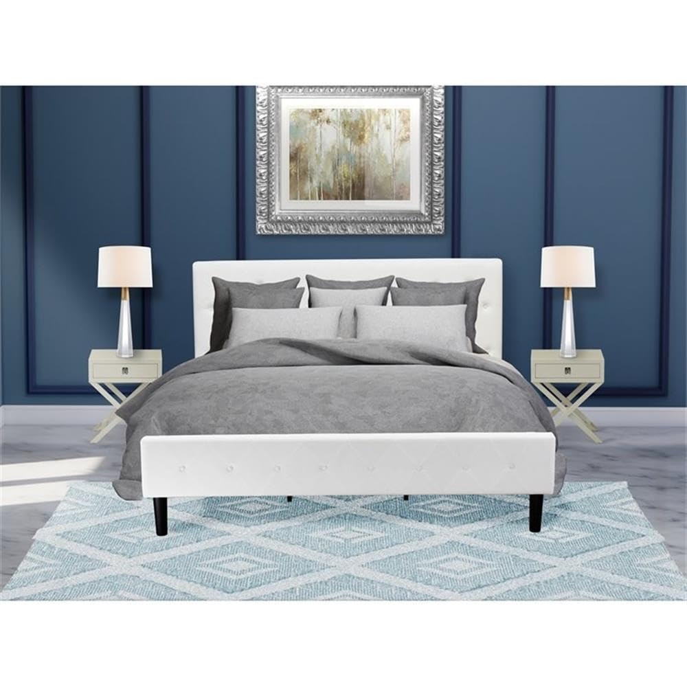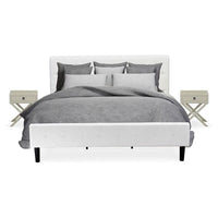 EAST WEST FURNITURE - NL19K-2HA14 - 3 PC WOODEN BEDROOM SETIndulge in the pinnacle of cutting-edge design and progressive vision with this enchanting king bedroom set. The wooden bed frame showcases a sleek Black finish, beautifully complemented by White Velvet upholstery, while the nightstand boasts a delightful Urban Gray design. Meticulously curated, this harmonious blend of colors allows the bedroom set to effortlessly enhance any bedroom decor, making it an alluring addition to your space. Elevate your bedroom with timeless charm by incorporating this exquisite wooden bedroom set, expertly crafted with durable wood. The set includes a king-size bed and a chic mid-century modern nightstand, infusing a touch of elegance into any bedroom arrangement. Its top-notch quality, versatility, and convenience ensure that this king-size bedroom set will elevate the ambiance of your bedroom. Not only does this bedroom set require minimal maintenance, but it also proves to be a cost-effective choice. Assembling the king platform bed frame is a breeze, thanks to the provided comprehensive step-by-step instructions and hardware pack.KING SIZE BED SET FEATURES: Material: Engineered Wood Platform Bed Frame Fabric: Velvet King Bed Fabric Color: White King Platform Bed Frame Legs Color: Black Night Stands for Bedroom Top Color: Urban Gray Night Stands for Bedrooms Legs Color: Urban Gray Dimensions of Bed: Length: 89; Width: 81; Height: 47. Night Stand Dimensions: Length: 19.7; Width: 15.7; Height: 23.6.Include in this Package: 1 King Platform Bed Frame and 2 Small Night StandNote: Mattress is not included with this Bed Frame.