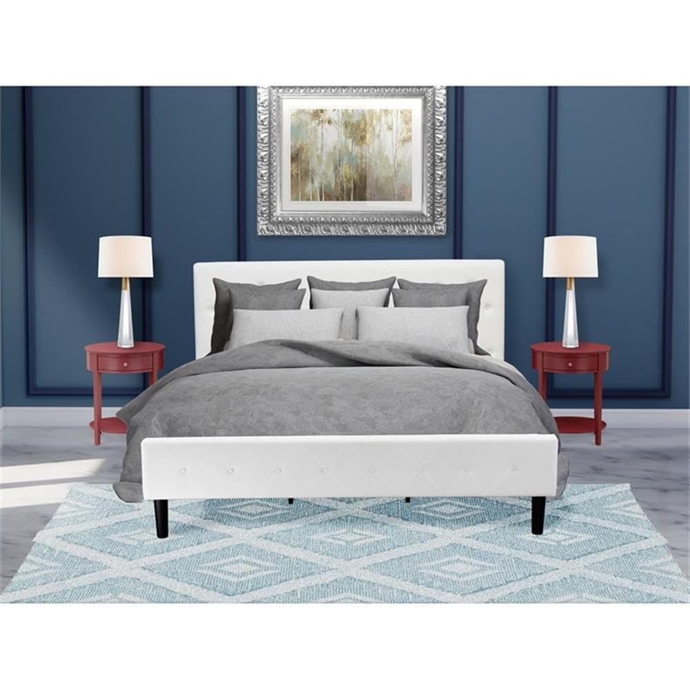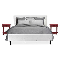 EAST WEST FURNITURE - NL19K-2HI13 - 3 PIECE KING SIZE BED SETExperience contemporary style and forward-thinking design with this exquisite king-size bedroom set. This stunning king bedroom set adds a touch of antique glamour to your bedroom. The platform bed features a sleek Black finish and elegant White Velvet upholstery, creating a captivating focal point. Accompanying the bed is a modern nightstand in a luxurious Burgundy hue, forming a striking color combination that effortlessly complements any room decor. Crafted from durable wood, this set includes a king-size bed and a mid-century nightstand, making it the perfect choice for any bedroom decor. The wood bedroom set guarantees top-notch quality, versatility, and convenience, ensuring it elevates the ambiance of your bedroom. Additionally, it requires minimal maintenance, making it a budget-friendly option. Assembling the platform bed frame is a breeze with the provided step-by-step instructions and hardware packs, allowing you to enjoy your stylish bedroom setup with ease.BEDROOM SET FEATURES: Material: Engineered Wood King Size Bed Fabric: Velvet King Platform Bed Fabric Color: White Wood Bed Frame Legs Color: Black Night Stands for Bedroom Top Color: Burgundy Nightstand Bedroom Legs Color: Burgundy Dimensions of Bed: Length: 89; Width: 81; Height: 47. Night Stand Dimensions: Length: 23.7; Width: 23.7; Height: 28.Include in this Package: 1 Bed Frame and 1 Modern NightstandNote: Mattress is not included with this Bed Frame.