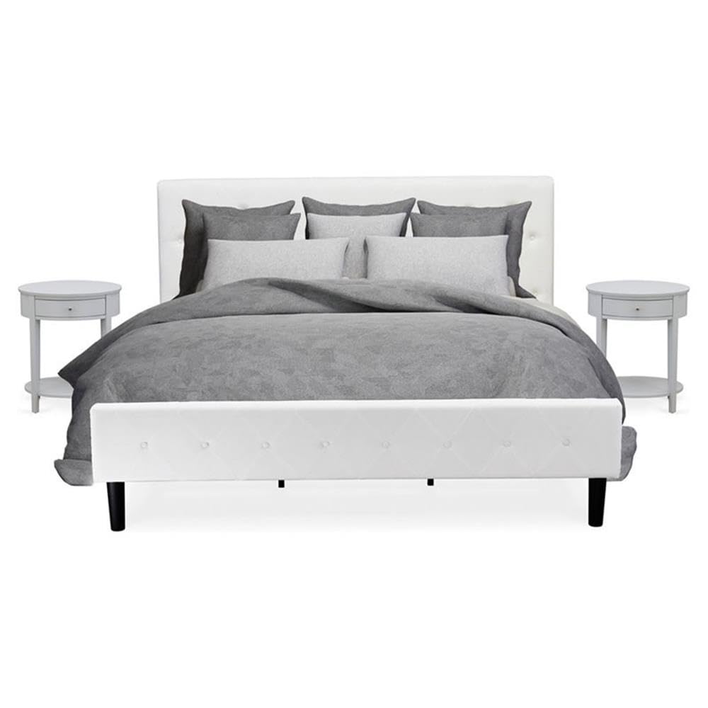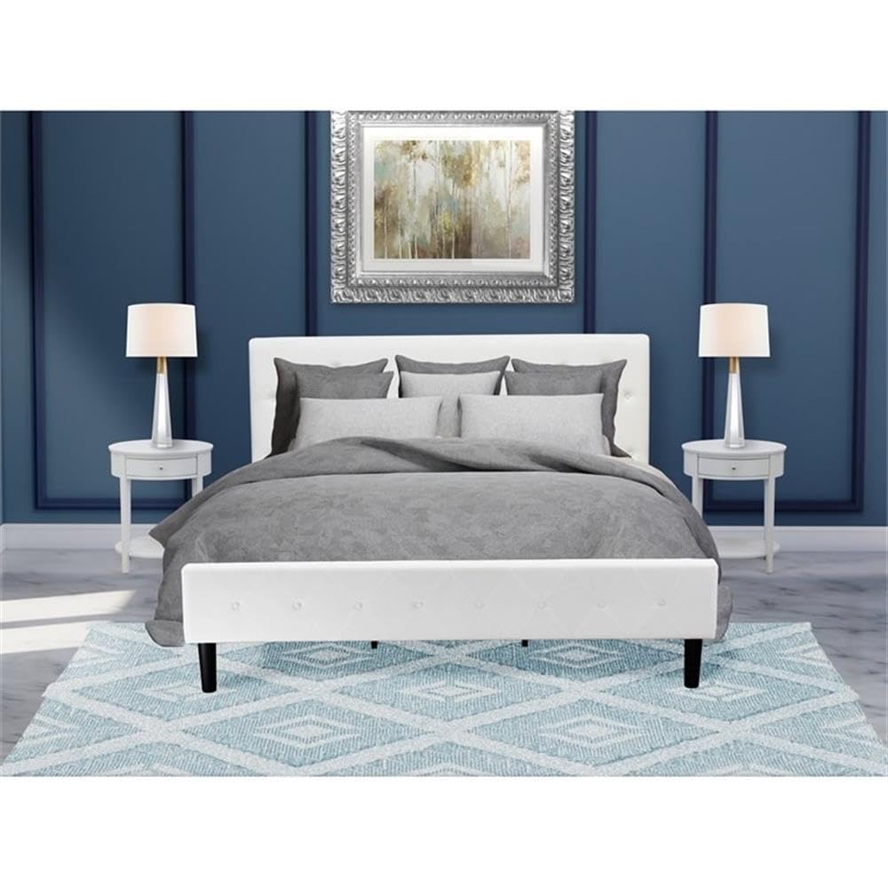 EAST WEST FURNITURE - NL19K-2HI14 - 3 PC BEDROOM SETThis attractive wood bedroom set is a shining example of innovative style and forward thinking. Add elements of classic glamour to your bedroom with this gorgeous king size bed set. Crafted with durable wood, this king size bedroom set contains a king bed and a wood night stand to decor any bedroom. This king bedroom set is sure to enhance any bedroom with quality, versatility, and convenience. This bed set is low maintenance furniture and it is a good choice because of how budget-friendly it is. This king size bed can be simply assembled with the provided step-by-step assembly instruction and hardware pack.KING BED SET FEATURES:Material: Engineered WoodPlatform Bed Fabric: VelvetKing Bed Fabric Color: WhitePlatform Bed Legs Color: BlackNight Stands for Bedrooms Top Color: Urban GrayWood Nightstand Legs Color: Urban GrayDimensions of Bed: Length: 89; Width: 81; Height: 47.Night Stand Dimensions: Length: 23.7; Width: 20; Height: 28.Include in this Package: 1 King Bed Frame and 2 Mid Century NightstandsNote: Mattress is not included with this King Bed.