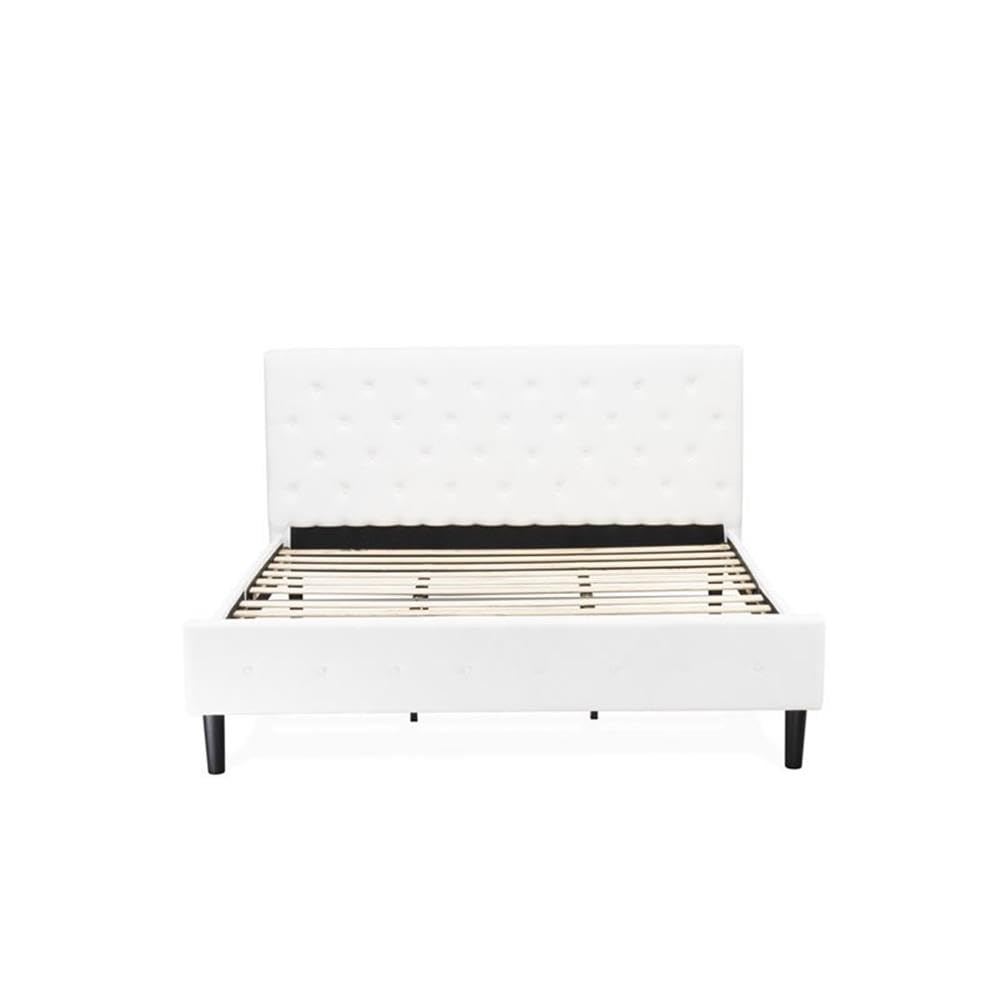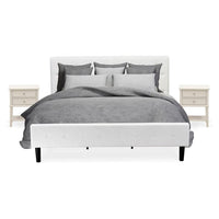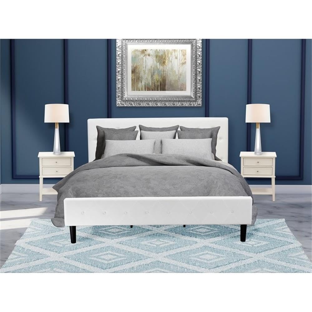 EAST WEST FURNITURE - NL19K-2VL0C - 3 PC KING BED SETThis stunning king bed set is a shining example of innovative design and forward thinking. Add elements of classic glamour to your bedroom with this gorgeous wooden bedroom set. Manufactured with durable wooden, this king bed set comes with king size bed and a wood night stand to decor any bedroom. This king bed set is sure to enhance any bedroom with quality, versatility, and convenience. This king size bed set is low maintenance furniture and it is a good choice because of how budget-friendly it is. This platform bed can be simply assembled with the provided step-by-step assembly instruction and hardware pack.KING BEDROOM SET FEATURES: Material: Engineered Wood Modern Bed Frame Fabric: Velvet King Bed Fabric Color: White Bed Frame Legs Color: Black Night Stands for Bedrooms Top Color: Wire Brushed Butter Cream Modern Nightstand Legs Color: Wire Brushed Butter Cream Dimensions of Bed: Length: 89; Width: 81; Height: 47. Night Stand Dimensions: Length: 22; Width: 15.7; Height: 28.Include in this Package: 1 King Bed Frame and 2 Wooden NightstandsNote: Mattress is not included with this Platform Bed Frame.