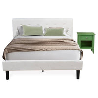 EAST WEST FURNITURE - NL19Q-1GA12 - 2 PIECE QUEEN BED SETExperience the captivating blend of modern style and progressive design with this queen bed set, making it an exquisite addition to your bedroom. The bed frame features a stylish Black finish that beautifully complements the elegant White Velvet Color. The modern nightstand's charming Clover Green hue creates a delightful color combination that seamlessly complements any room's decor. Crafted meticulously from durable wood, this stunning queen bed set infuses your space with touches of timeless glamour. Included in the set are a wooden bed frame and nightstands, allowing you to elevate your bedroom decor effortlessly. Emphasizing quality, versatility, and convenience, this bed set is sure to enhance the overall appeal of your bedroom. It's a budget-friendly, low-maintenance furniture option, making it an ideal choice. With the provided step-by-step instructions and hardware pack, you can easily assemble the platform queen bed frame.MODERN BEDROOM SET FEATURES: Material: Engineered Wood Queen Size Bed Frame Fabric: Velvet Queen Bed frame Fabric Color: White Queen Size Bed Legs Color: Black Mid Century Nightstand Top Color: Clover Green Night Stands For Bedrooms Legs Color: Clover Green Dimensions of Bed: Length: 89; Width: 65; Height: 41.30. Night Stand Dimensions: Length: 21; Width: 18; Height: 24.Include in this Package: 1 Queen Size Bed and 1 Wood NightstandNote: Mattress is not included with this Platform Bed.