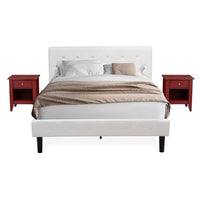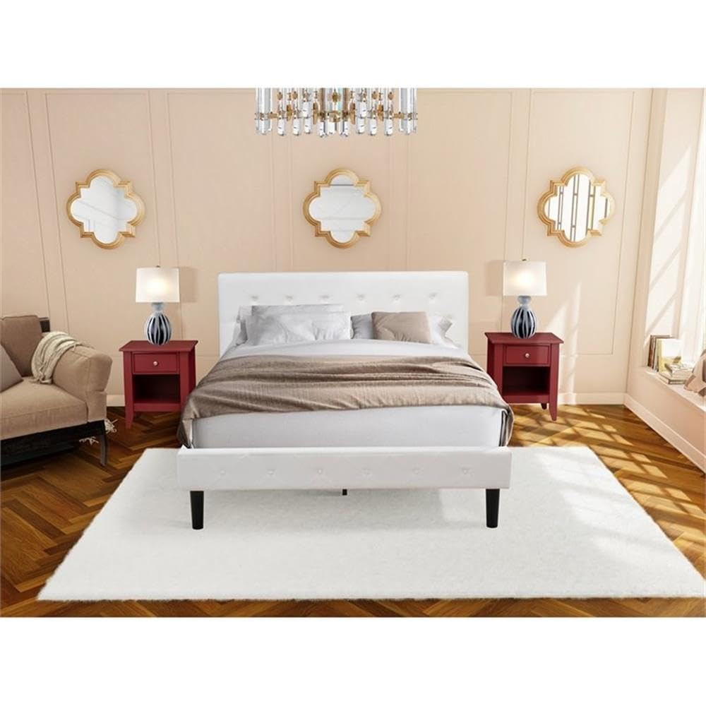 EAST WEST FURNITURE - NL19Q-2GA13 - 3 PIECE QUEEN SIZE BED SETDiscover the allure of innovative design and forward-thinking with this captivating modern bedroom set. Embrace elements of traditional glamour by choosing this exquisite queen-size bedroom set that will infuse your bedroom with a touch of elegance. The platform bed frame showcases a sleek Black finish, while the Velvet Color option offers a pristine White appearance. The nightstands, available in a sophisticated Burgundy hue, create a visually appealing color combination that effortlessly complements any bedroom decor. Crafted from robust wood, the set includes a queen bed and a wooden nightstand, providing exceptional decor for your bedroom. Elevate your sleeping space with this queen-size bedroom set, which blends quality, versatility, and convenience seamlessly. Additionally, its low-maintenance nature and budget-friendly appeal make it an excellent choice. Assembling the queen-size bed is a breeze with the included step-by-step instructions and hardware pack.BEDROOM SET FEATURES: Material: Engineered Wood Queen Size Bed Fabric: Velvet Modern Bed Frame Fabric Color: White Platform Bed Legs Color: Black Wooden Nightstand Top Color: Burgundy Small Nightstand Legs Color: Burgundy Dimensions of Bed: Length: 89; Width: 65; Height: 41.30. Night Stand Dimensions: Length: 21; Width: 18; Height: 24.Include in this Package: 1 Queen Bed and 2 Mid Century Nightstands.Note: Mattress is not included with this Queen Size Bed Frame.