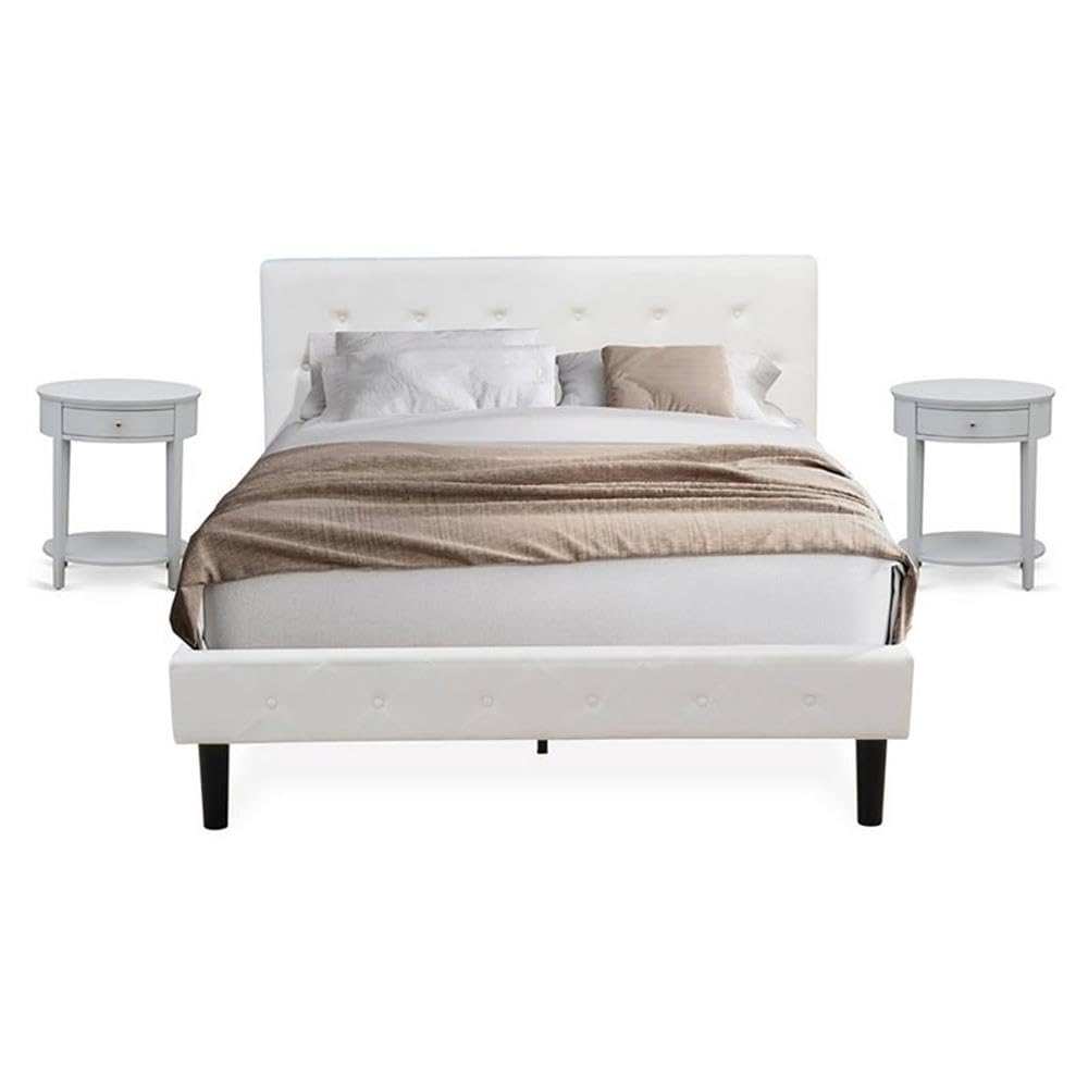 East West Furniture NL19Q-2HI14 3 Piece Bed Set - Button Tufted Platform Bed - Linen white Velvet Fabric Upholstered Headboard and an Urban Gray Finish Nightstand