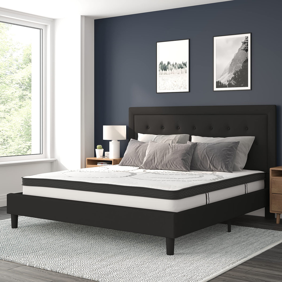 Flash Furniture Roxbury King Size Tufted Upholstered Platform Bed In Black Fabric With 10 Inch Certipur-Us Certified Pocket Spring Mattress