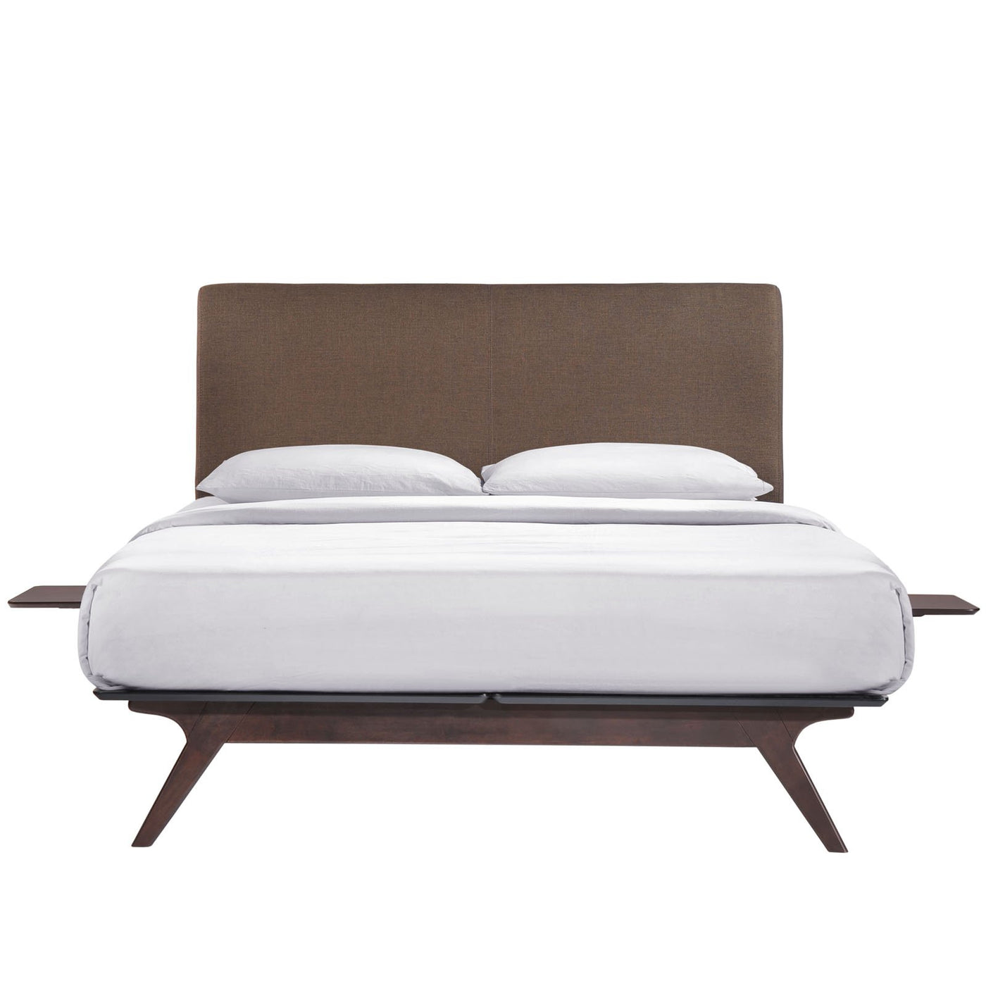 Modway Tracy Mid-Century Modern Wood Platform Queen Bed with Two Nightstands in Cappuccino Brown