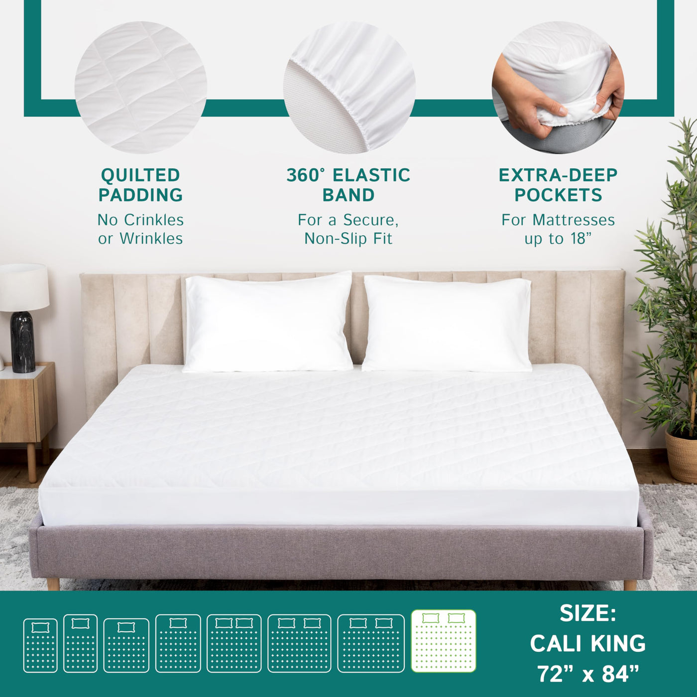 Four Seasons Essentials Five-Sided Fitted Sheet Style Mattress Pad Wraps Around Your Mattress And Offers Protection Against Liquids, Moisture, Dust. Our Premium Mattress Pads Are Hypoallergenic, Noiseless And Made Of Soft Breathable Fabric. The Elastic Edge Means It'S Easy To Put On And Remains In Place Throughout The Night. The Stretchy Fabric Means It'S Compatible With Mattresses Of Different Depths And Can Fit Deep Pocket Mattresses Up To 18 Inch Depth. Our Mattress Pad Has A Quilted, Padded, Pillow Top Layer. This Acts A Soft Mattress Topper Ensuring Extra Comfort While Offering 100% Waterproof Protection For Your Mattress. Our Cali King Measures 72'' X 84'' Which Is The Perfect Size Protector For Any Cal King Mattress Soft And Breathable Fabric Keeps Mattress Dry And Protected Relief From Dust Allergens Superior Air-Flow Easy To Put On & Remove Easy To Clean Fits Up To 18'' Deep