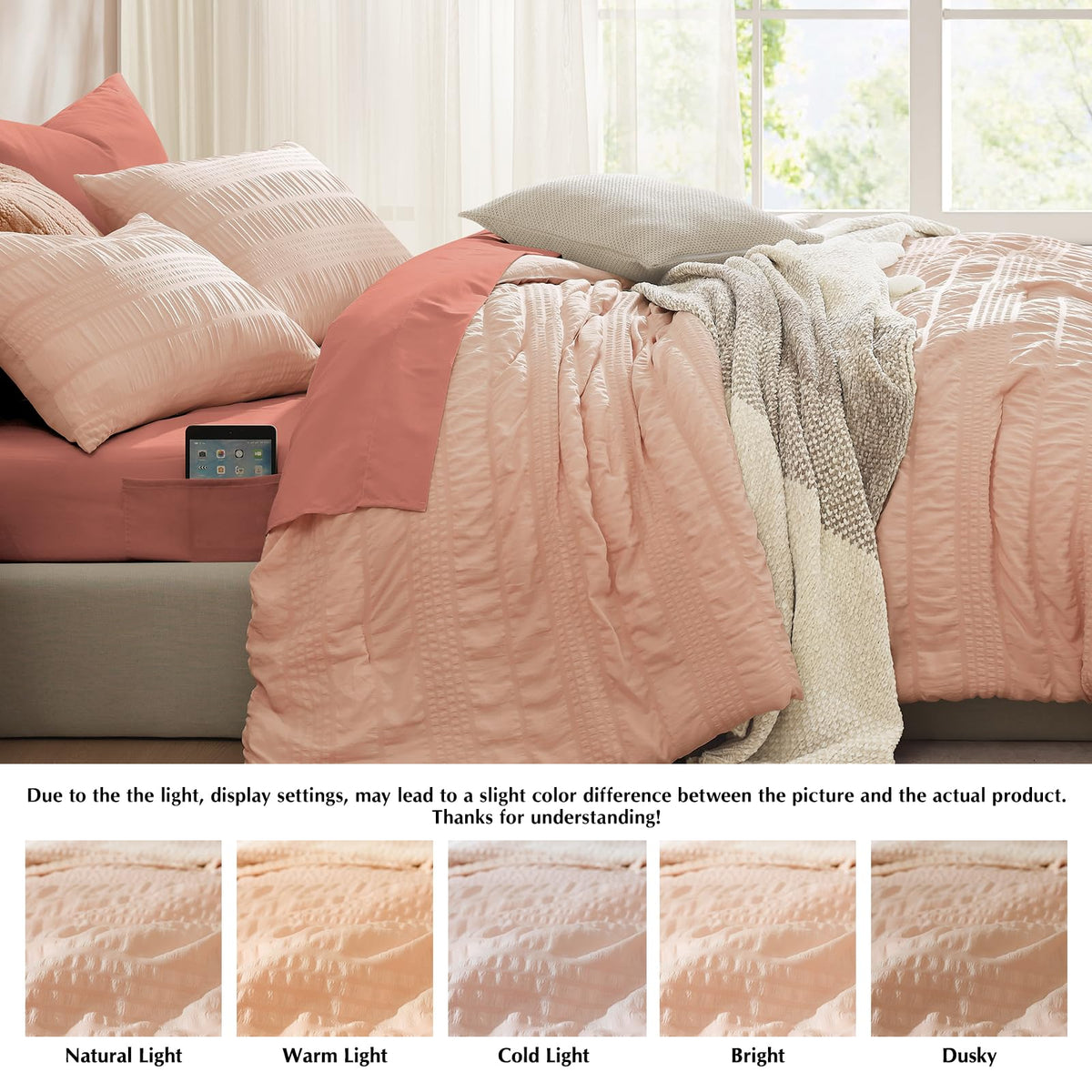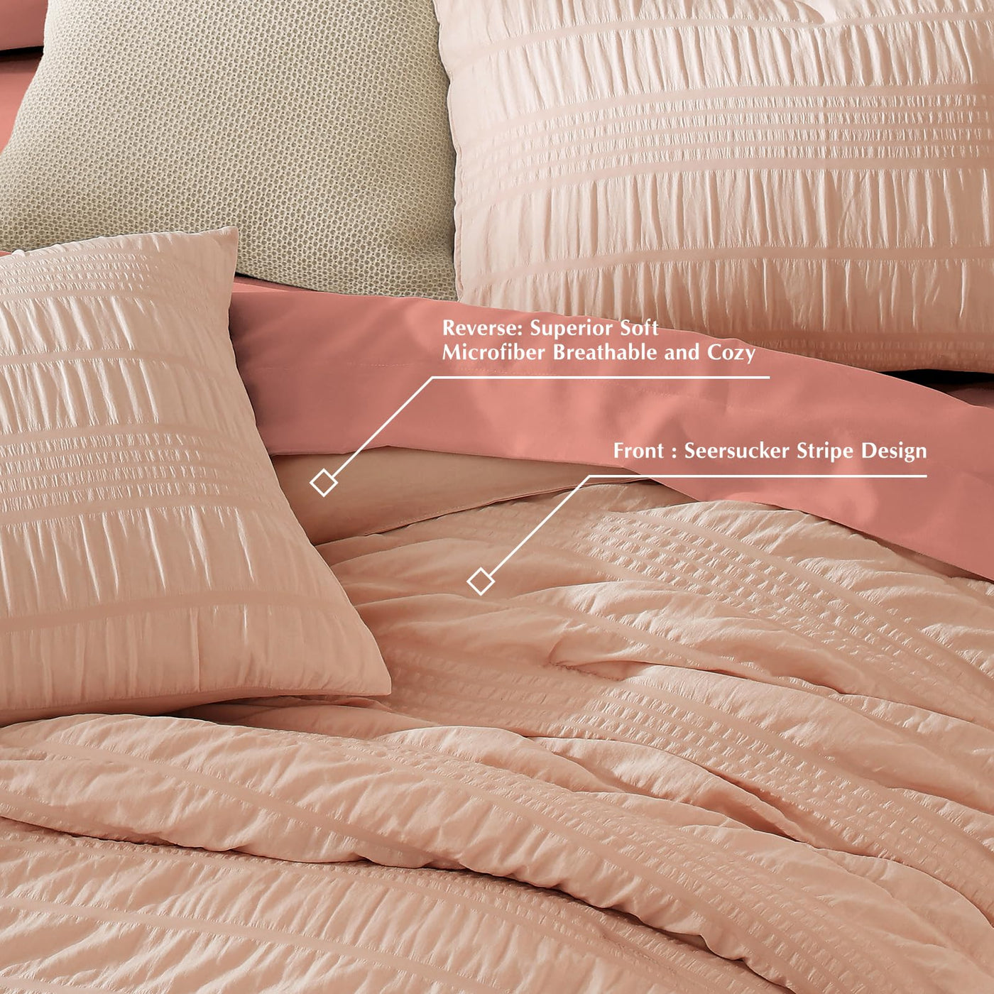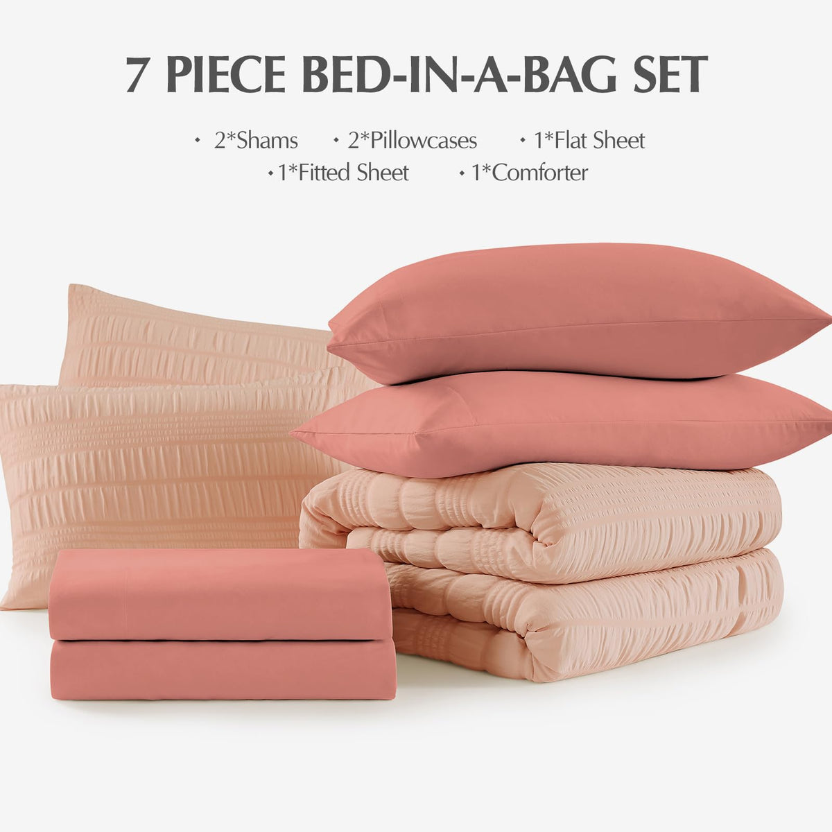 Casaagusto Queen Comforter Set, 7 Pieces Pink Seersucker Bed In A Bag Queen Size Soft All Seasons, Bedding Sets With Comforter, Flat Sheet, Fitted Sheet, 2 Pillow Shams, 2 Pillowcases