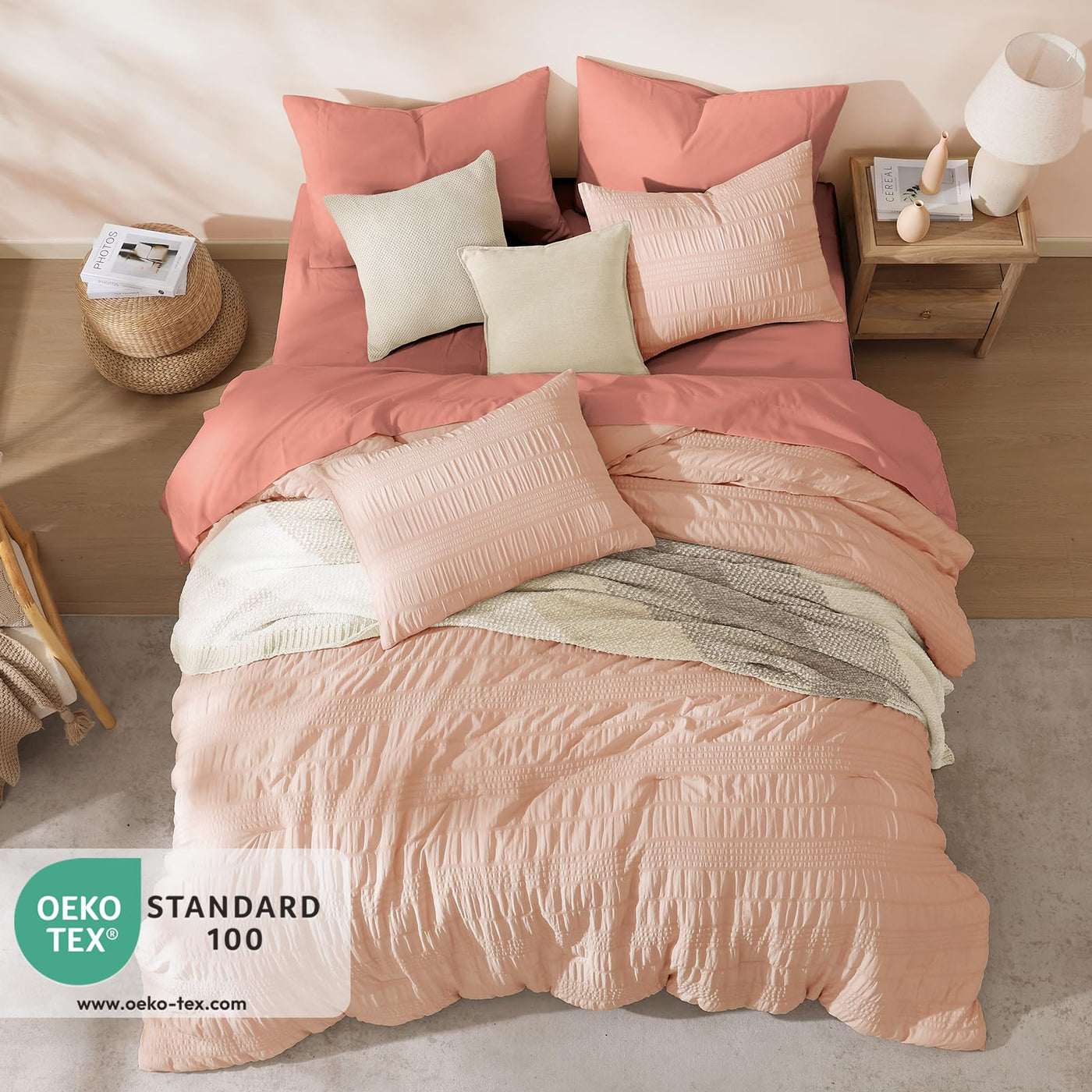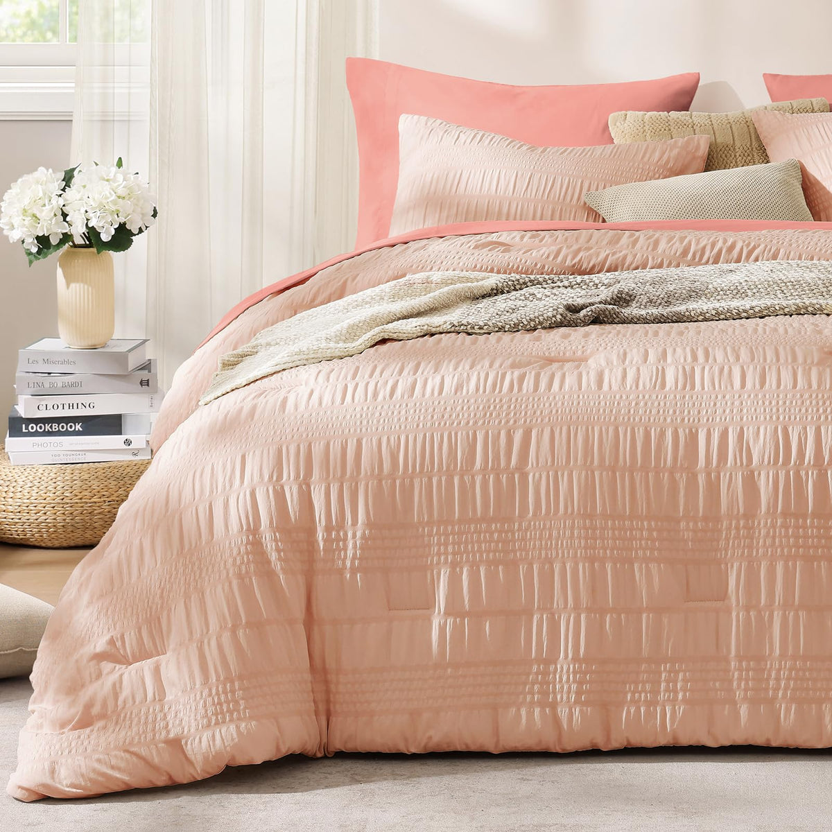 Casaagusto Queen Comforter Set, 7 Pieces Pink Seersucker Bed In A Bag Queen Size Soft All Seasons, Bedding Sets With Comforter,