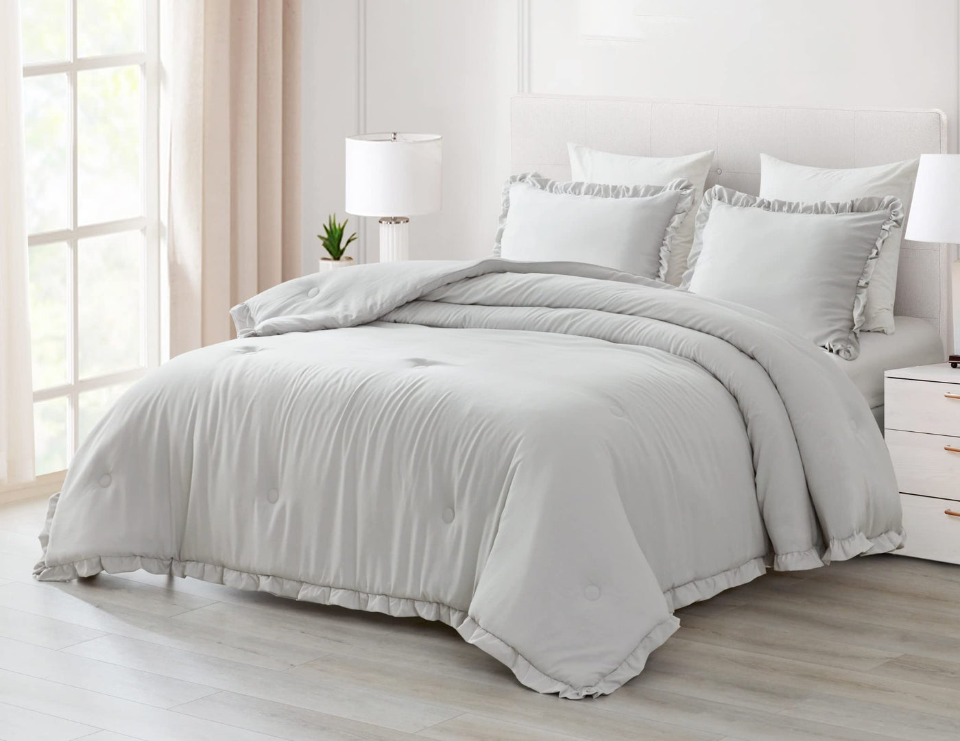 Transform Your Bedroom In A Sophisticated And Luxurious Manner With This Welcoming Comforter Bedding Set. An Attractive Ruffled Edge Trim With An Elegant Yet Simple Presentation That Makes You Feel Right At Home. Providing Everyday Comfort In A Fashionable Manner. Lightweight, High Loft Comforter With Adequate Warmth For Year-Round Use. The Comforter Is Made Of 100% Microfiber Polyester, Giving A Super Soft Smooth And Cozy Feel. The Fabric Is Stone-Washed Which Creates An Natural Attractive Crinkled Fabric Effect To Enhance The Aesthetics Of The Comforter.