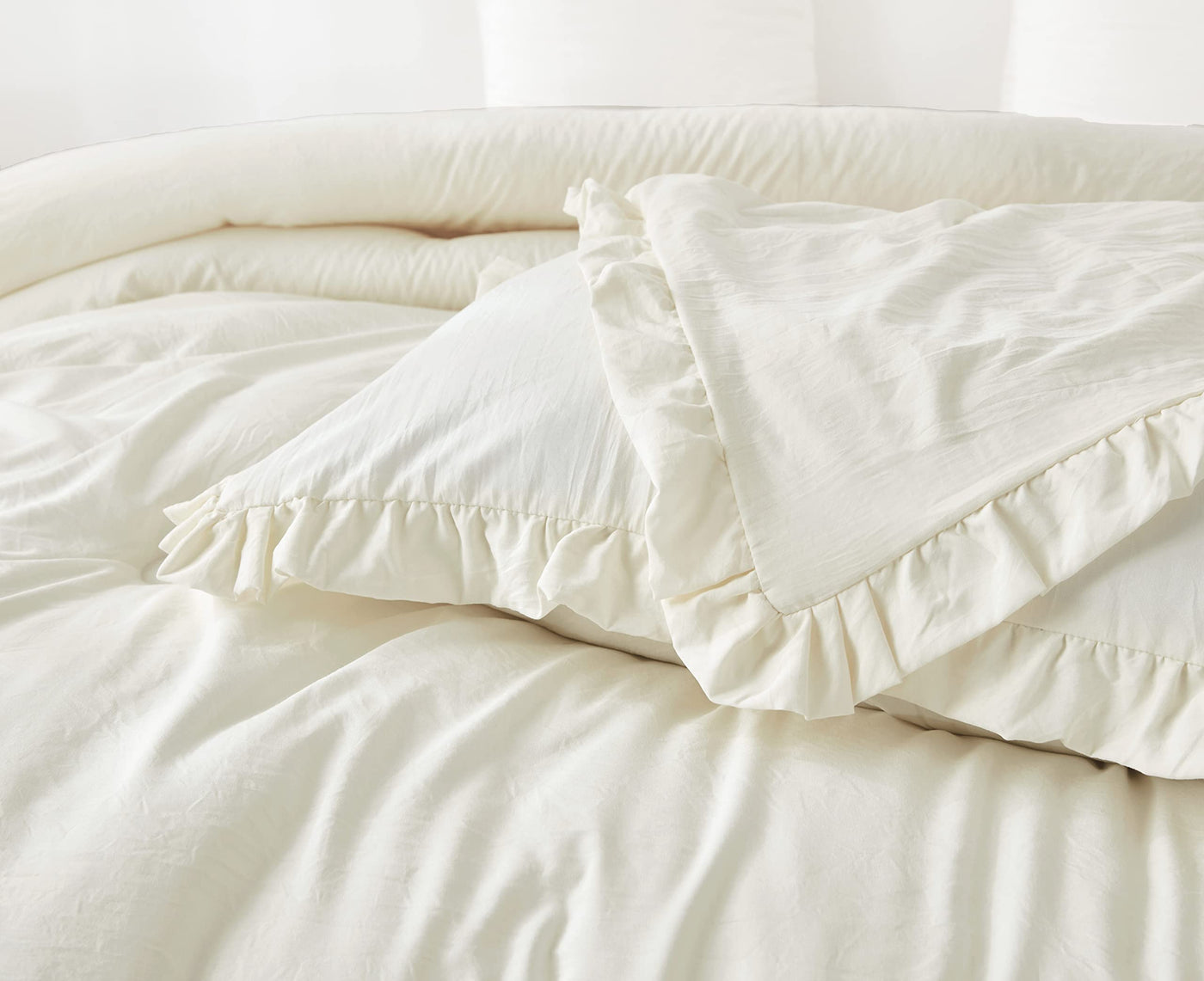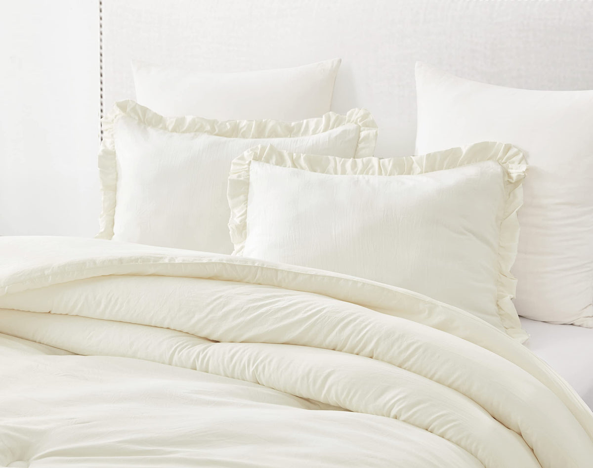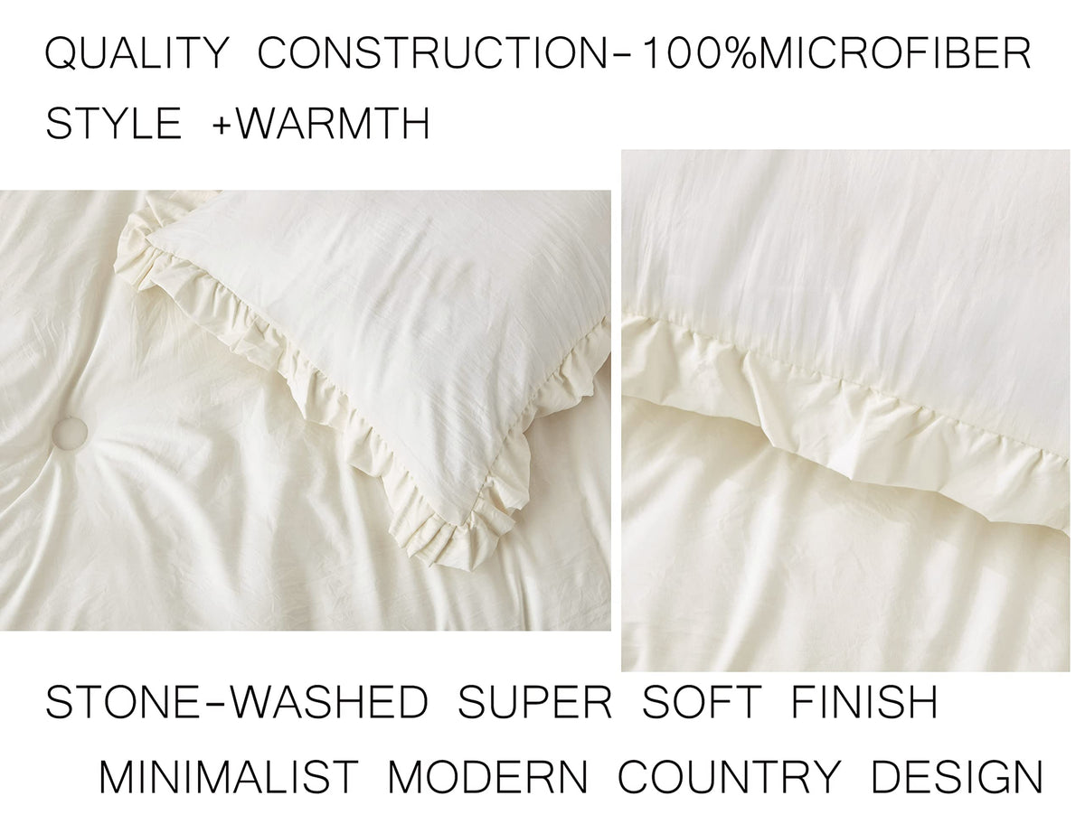 Chezmoi Collection Nora 3-Piece Ruffled Edge Trim Soft Washed Microfiber Comforter Set (Oversized Queen, Ivory)
