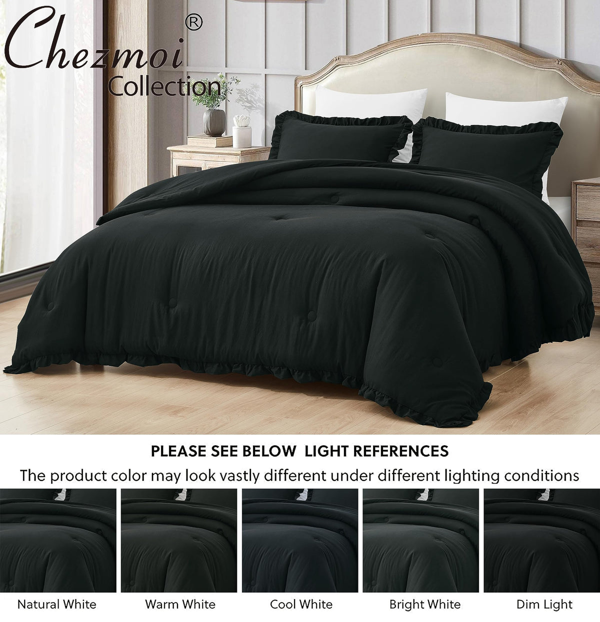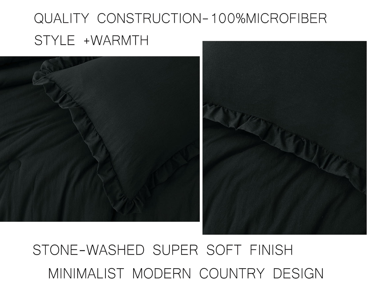 Chezmoi Collection Nora Black Comforter Set Oversized Queen Size 3-Piece Fluffy Soft Lightweight Bedding Ruffled Edge Trim Stone