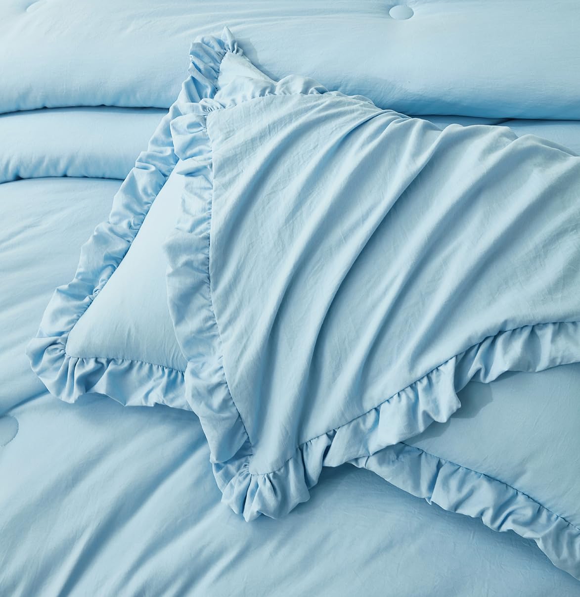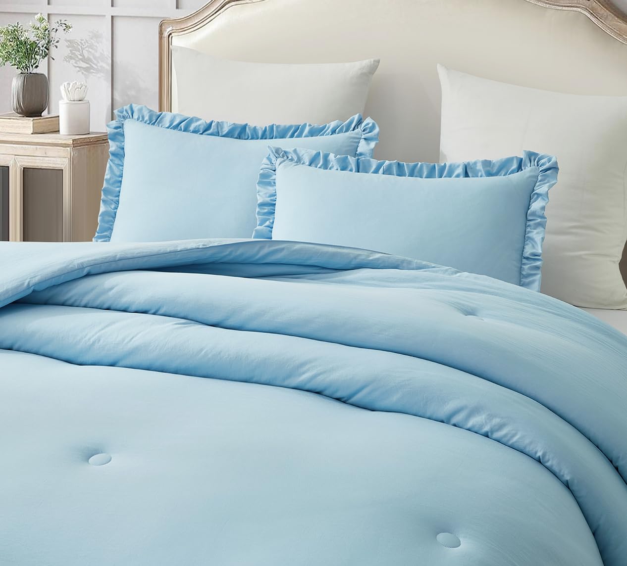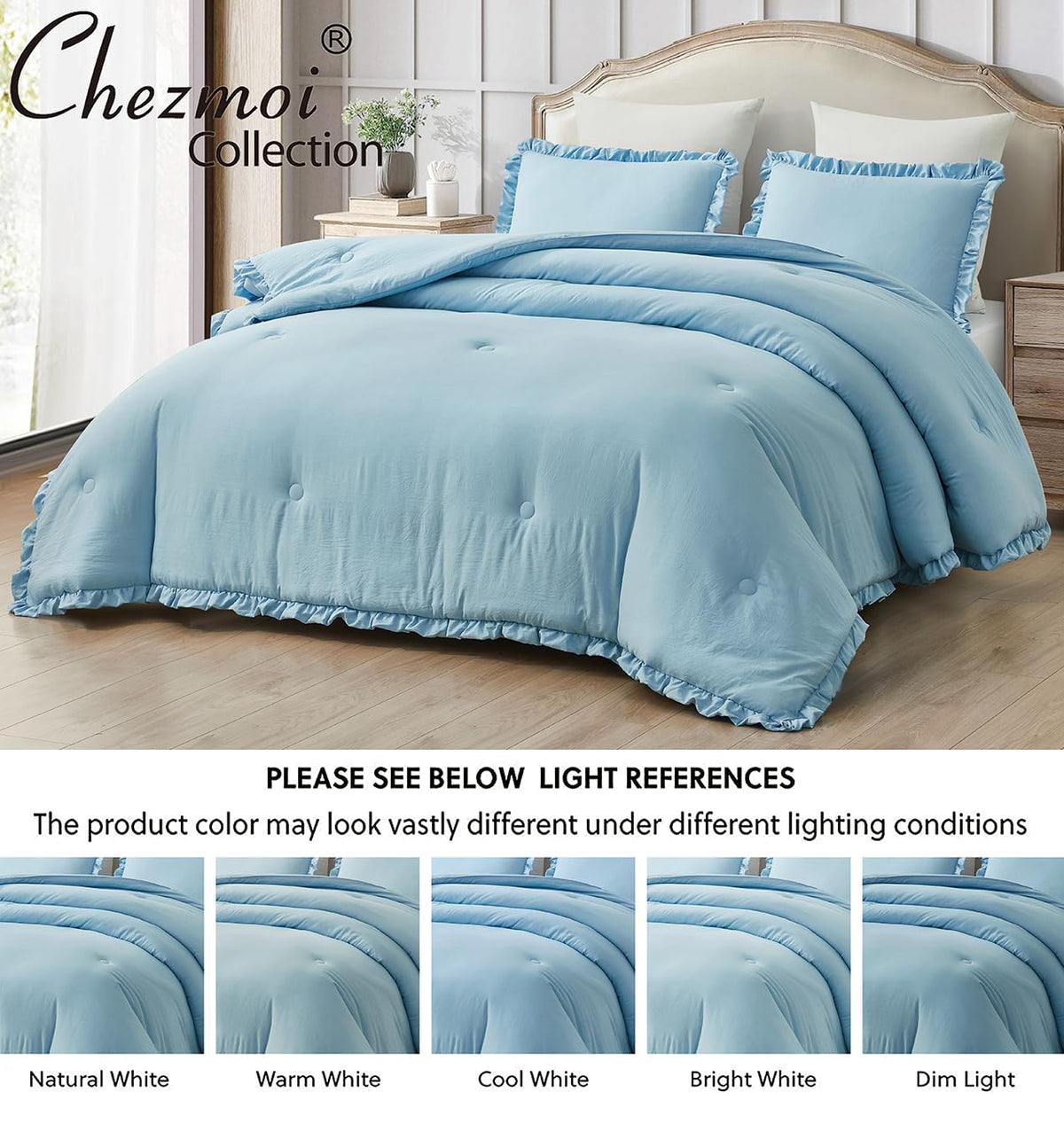 Q: Does the Chezmoi Collection Nora Comforter Set come in different colors?A: Yes, the Chezmoi Collection Nora Comforter Set is available in a variety of timeless colors, including the elegant Chambray Blue with a ruffled edge, enhancing any bedroom decor.