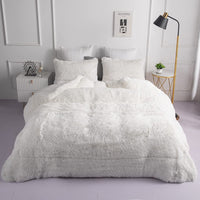 Q: What are the materials used in the chovy Faux Fur Plush Comforter Set?A: The chovy Faux Fur Plush Comforter Set features a front made of plush fabric, which is both beautiful and unique, while the back is crafted from crystal velvet. It is filled with 200gsm rain cotton, providing a soft and warm experience.