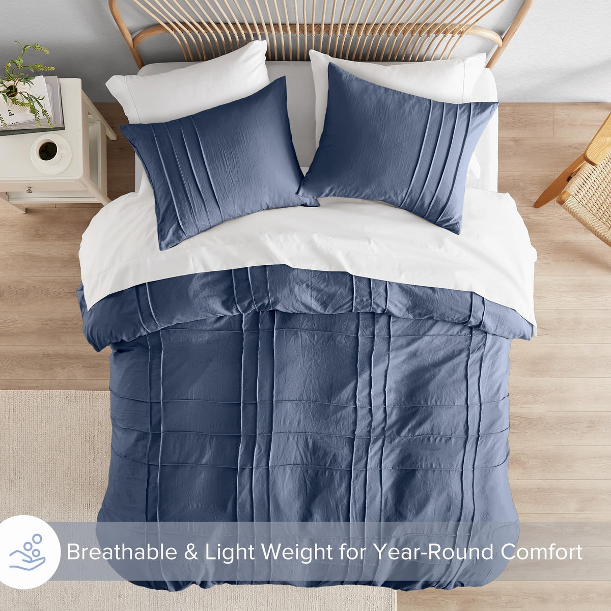 Comfort Spaces Navy Queen Size Duvet Cover Set - 3-Pc Pintuck Pleated Duvet Cover Queen, All Season Lightweight, Extra Softness Pre-Washed Microfiber Queen Bed Cover Shams, Queen