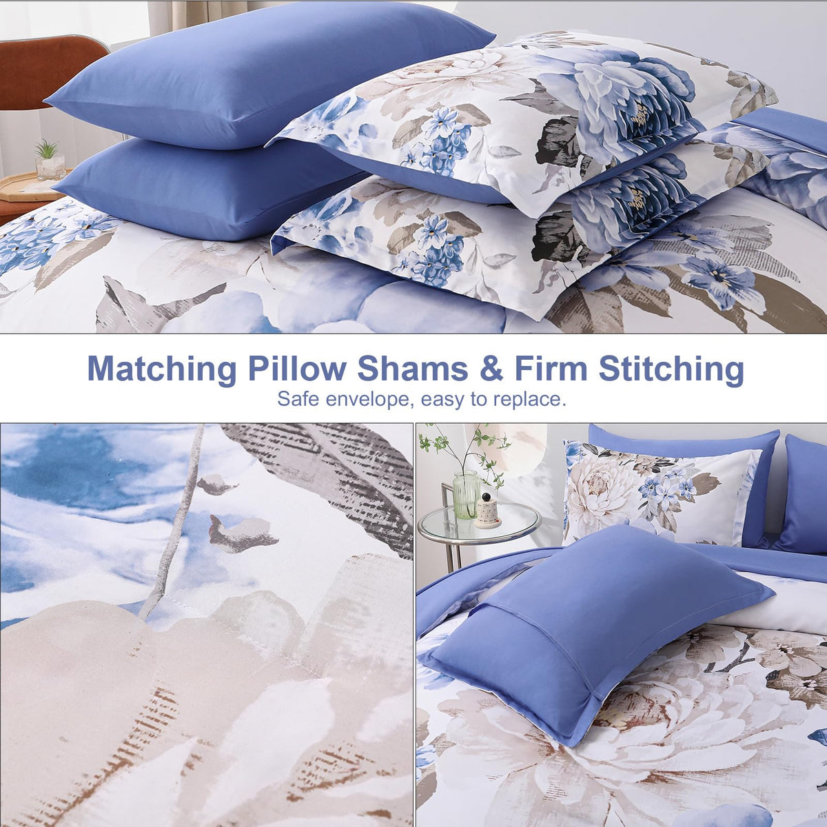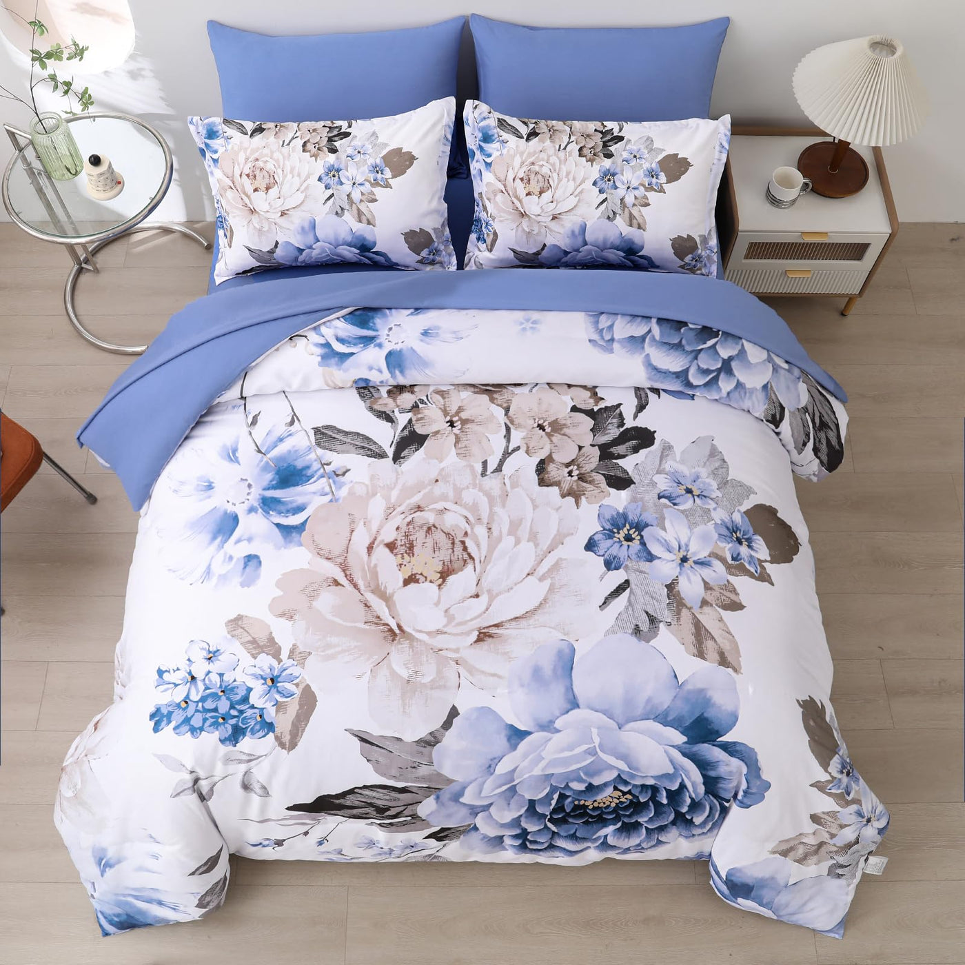 Q: What is the design of the comforter set?A: The comforter features an elegant blue floral pattern with a reversible design. One side showcases vivid floral and leaves print, while the other side is a solid color, allowing you to change the look of your bedding easily.