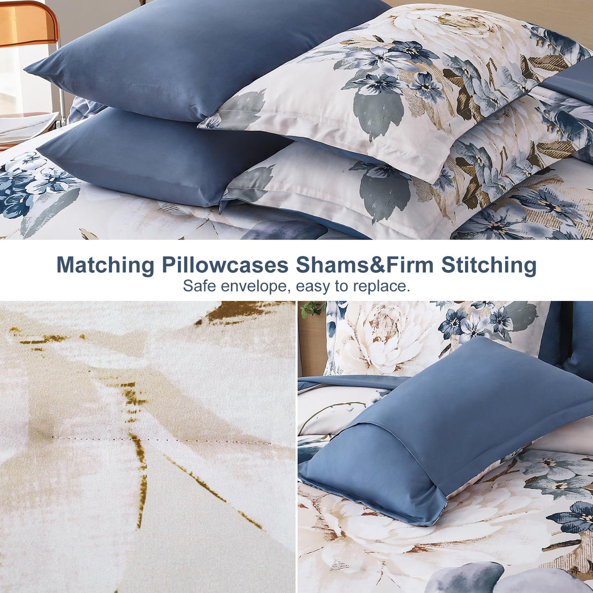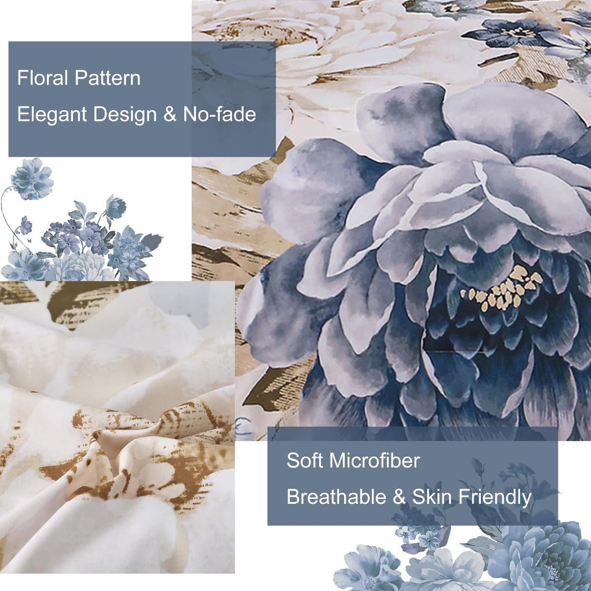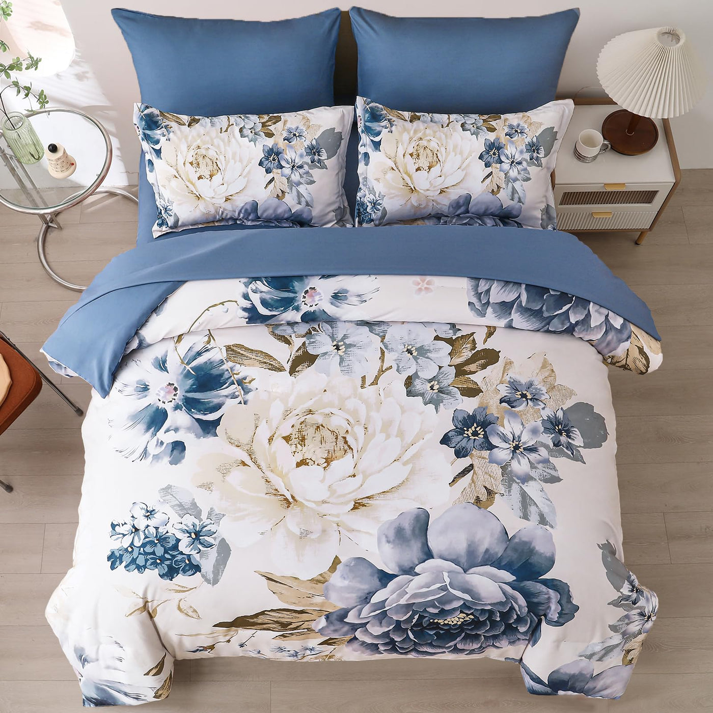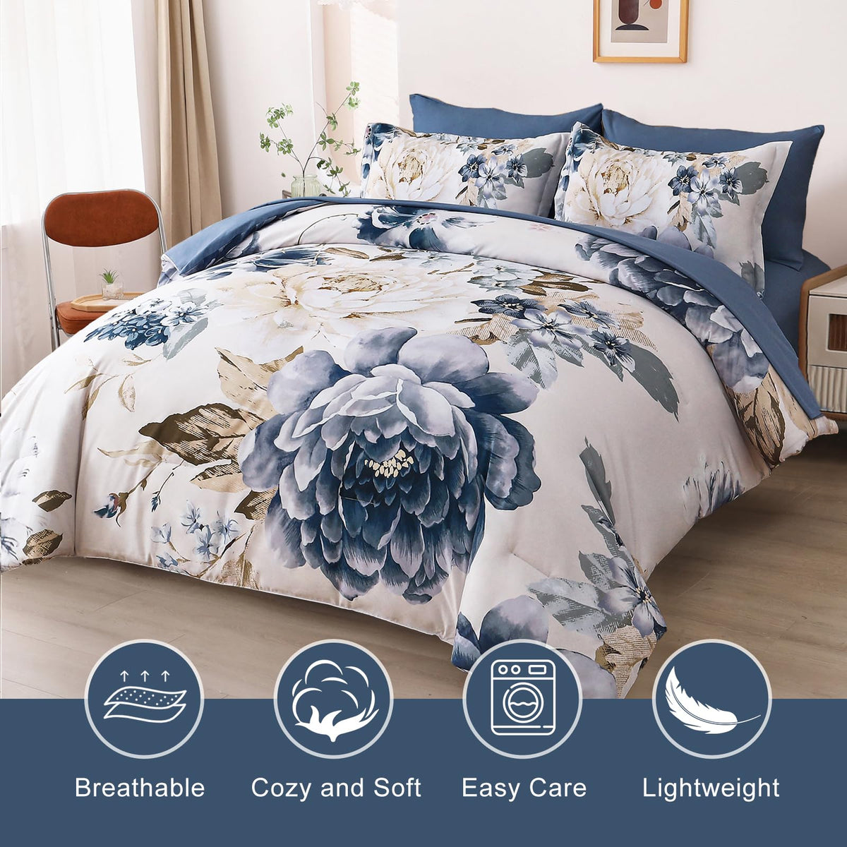 Dintszyayue Queen Size Comforter Set 7 Pieces Bed In A Bag Blue Floral Printed On Beige Comforter Elegant Flower Bedding Comfort