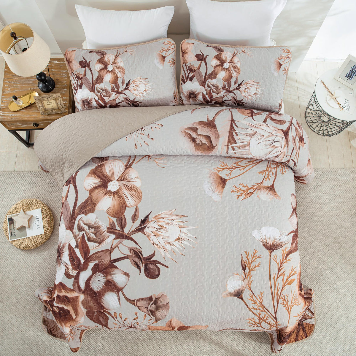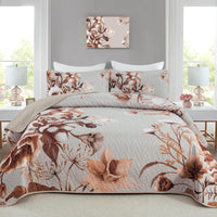 Drucon Khaki Floral Quilt Set Queen 3 Pieces Boho Flower Quilt Coverlet Set Soft Microfiber Lightweight Floral Quilted Bedspread