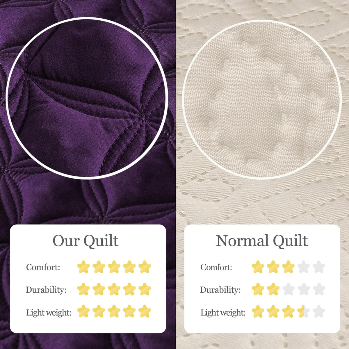 Q: What makes this quilt set comfortable and durable?A: The quilt set features a 3-layer design with tight stitching, providing softness while also being durable. Its lightweight nature ensures comfort without overheating, making it an ideal companion for various sleeping conditions.