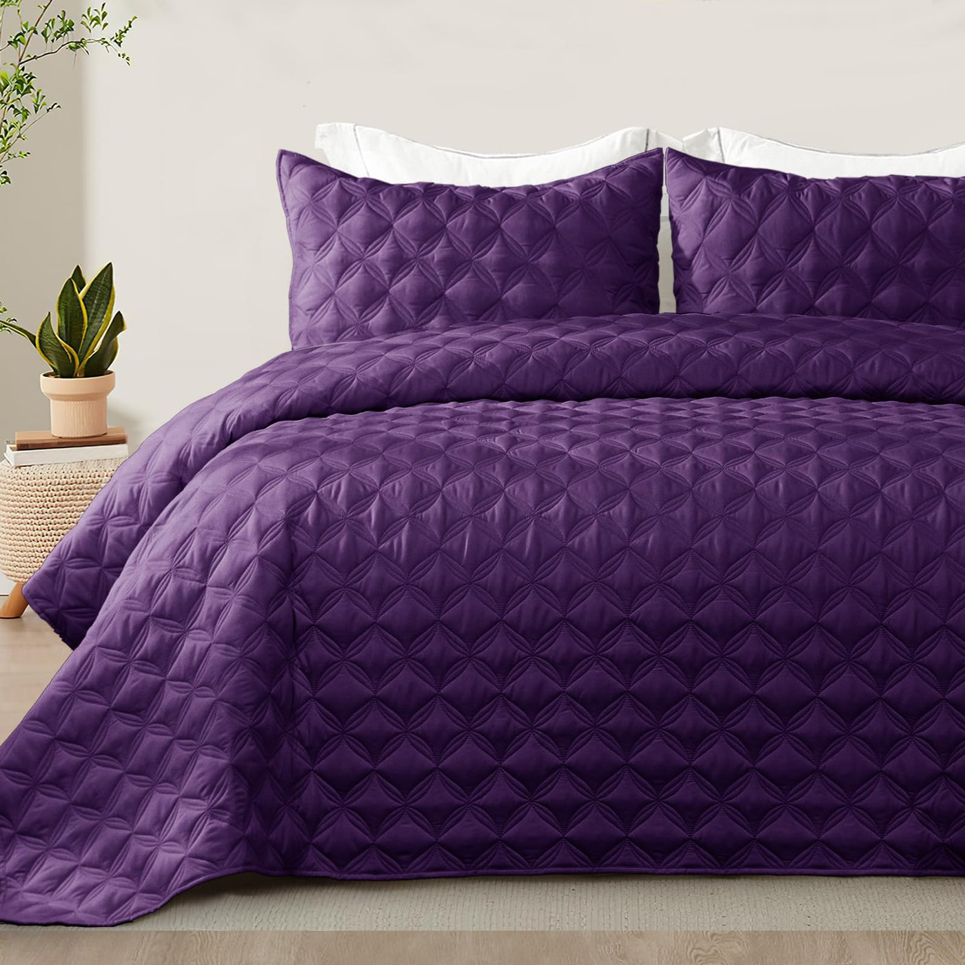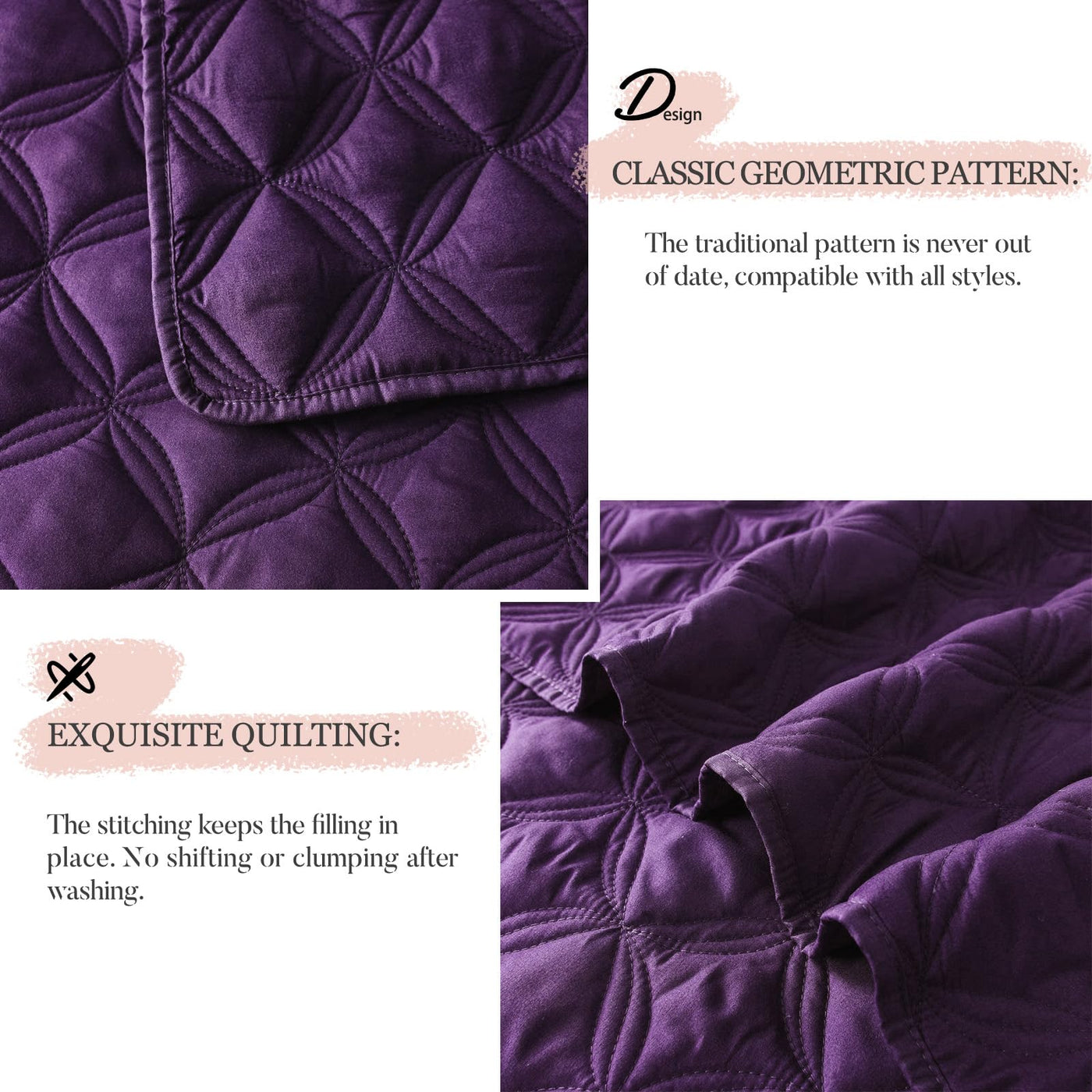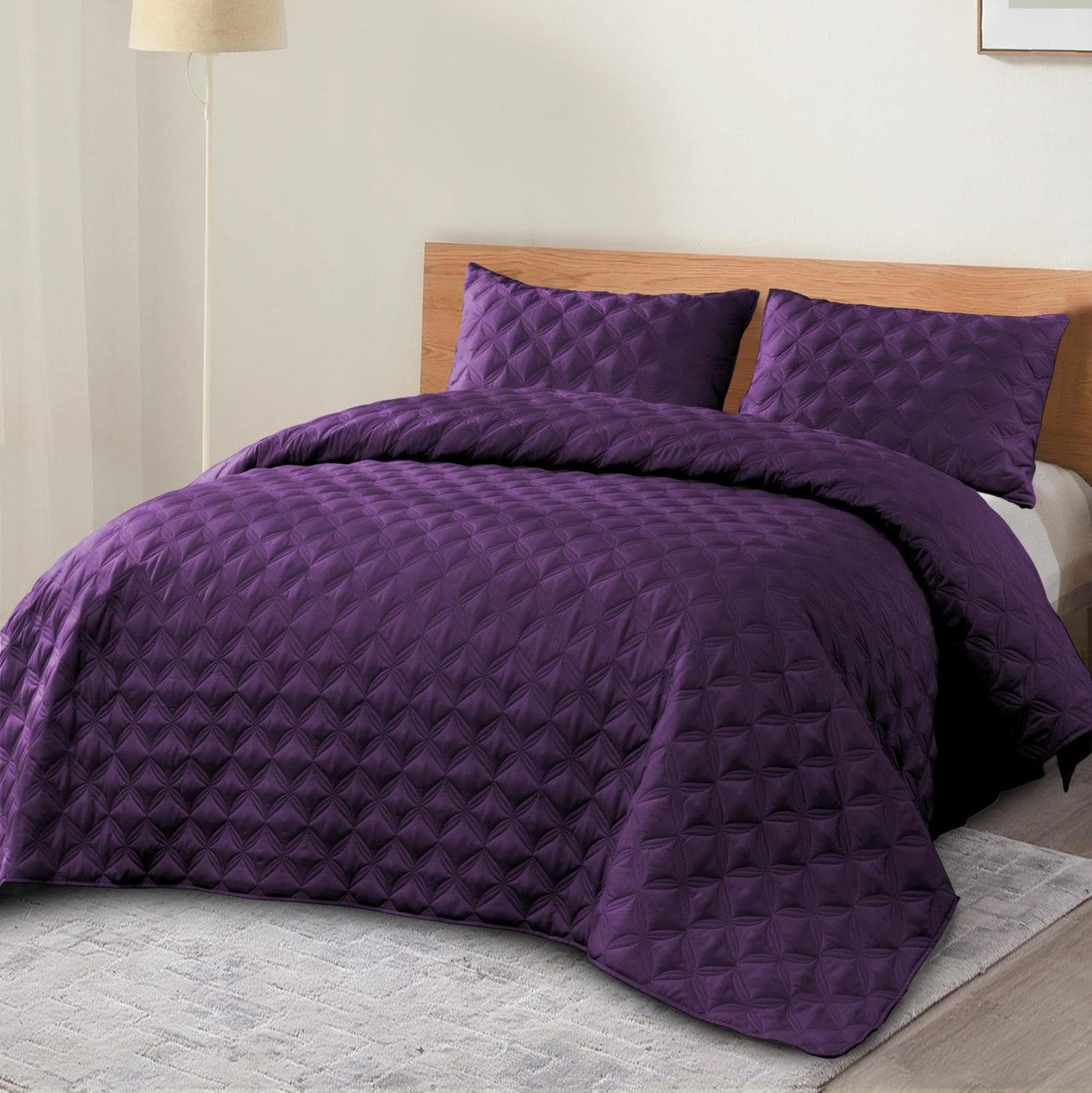 Q: Does the quilt set have any special design features?A: The quilt features a delicate geometric quilted stitching in a solid color, offering an elegant and classic look that easily matches various bedroom decors.