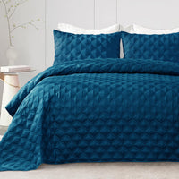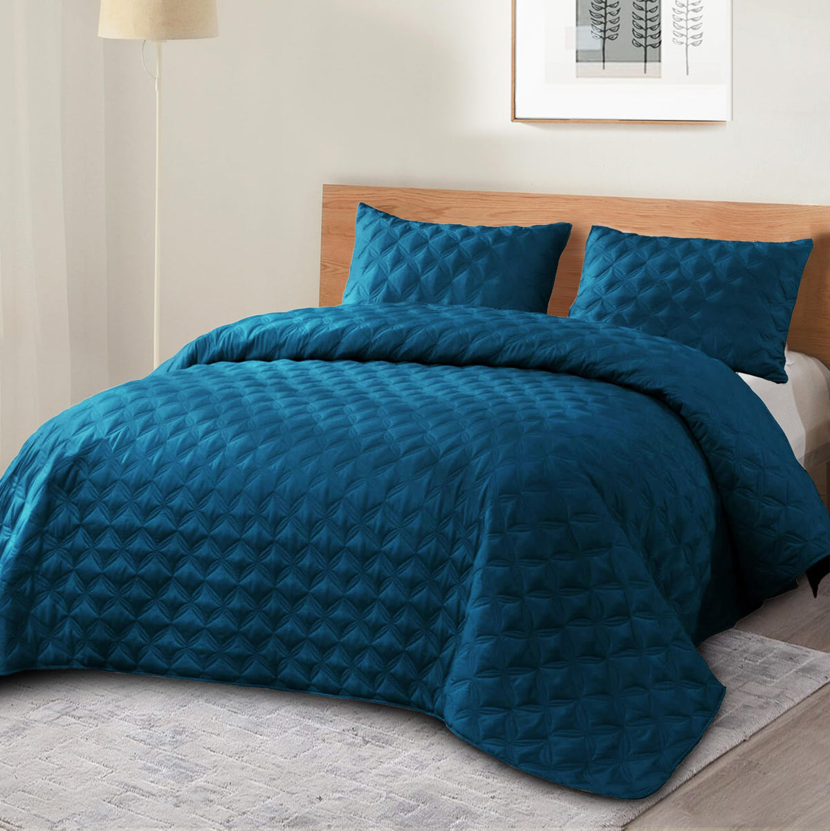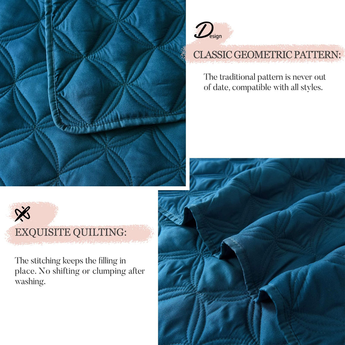 Q: What makes this quilt set durable and long-lasting?A: The quilt set is crafted from durable microfiber polyester, featuring a 3-layer design and tight stitching that enhance its longevity, ensuring no fading, pilling, or shedding, and it holds up well after multiple washes.