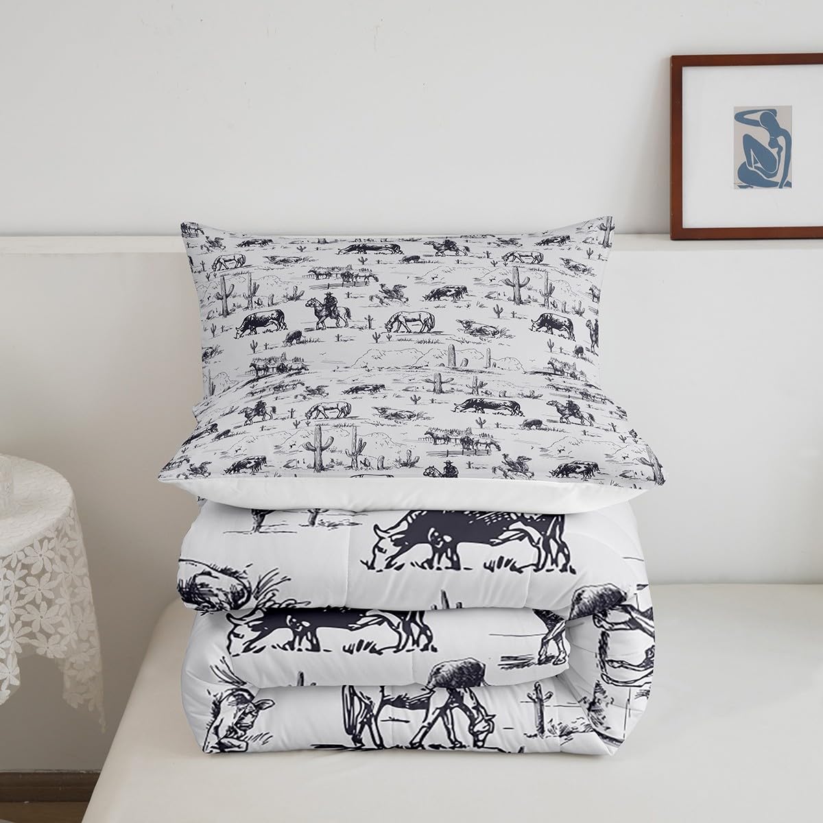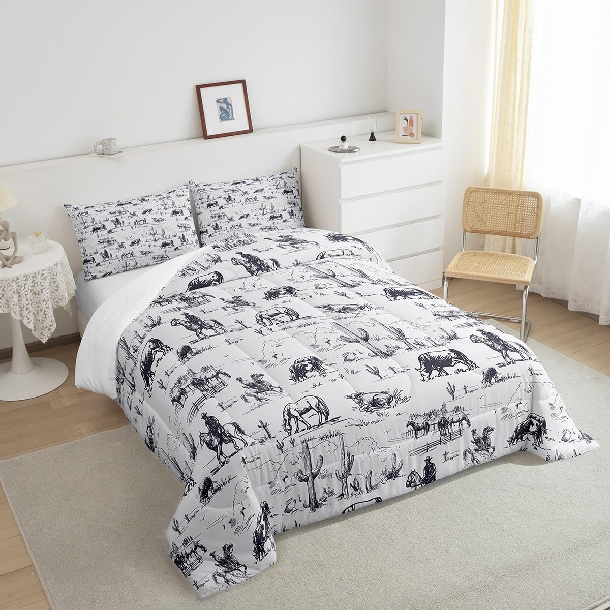 Feelyou Western Comforter Set Twin Size, White And Black Cowboy Cow Bedding Set Cowboy Comforter Desert Cactus Duvet Set Soft Be
