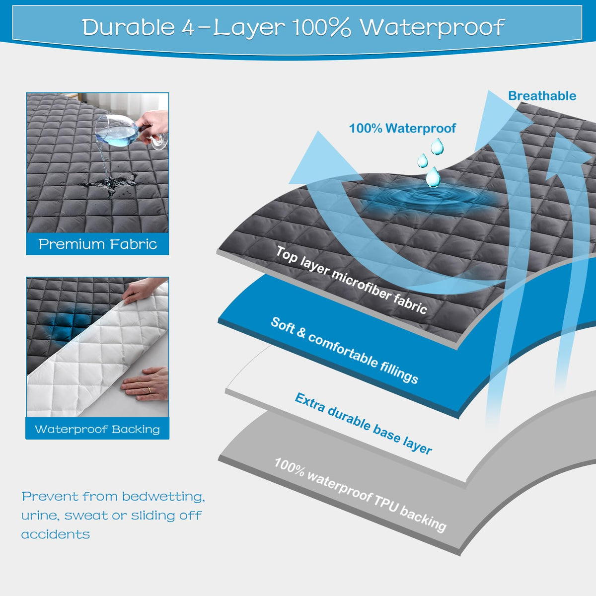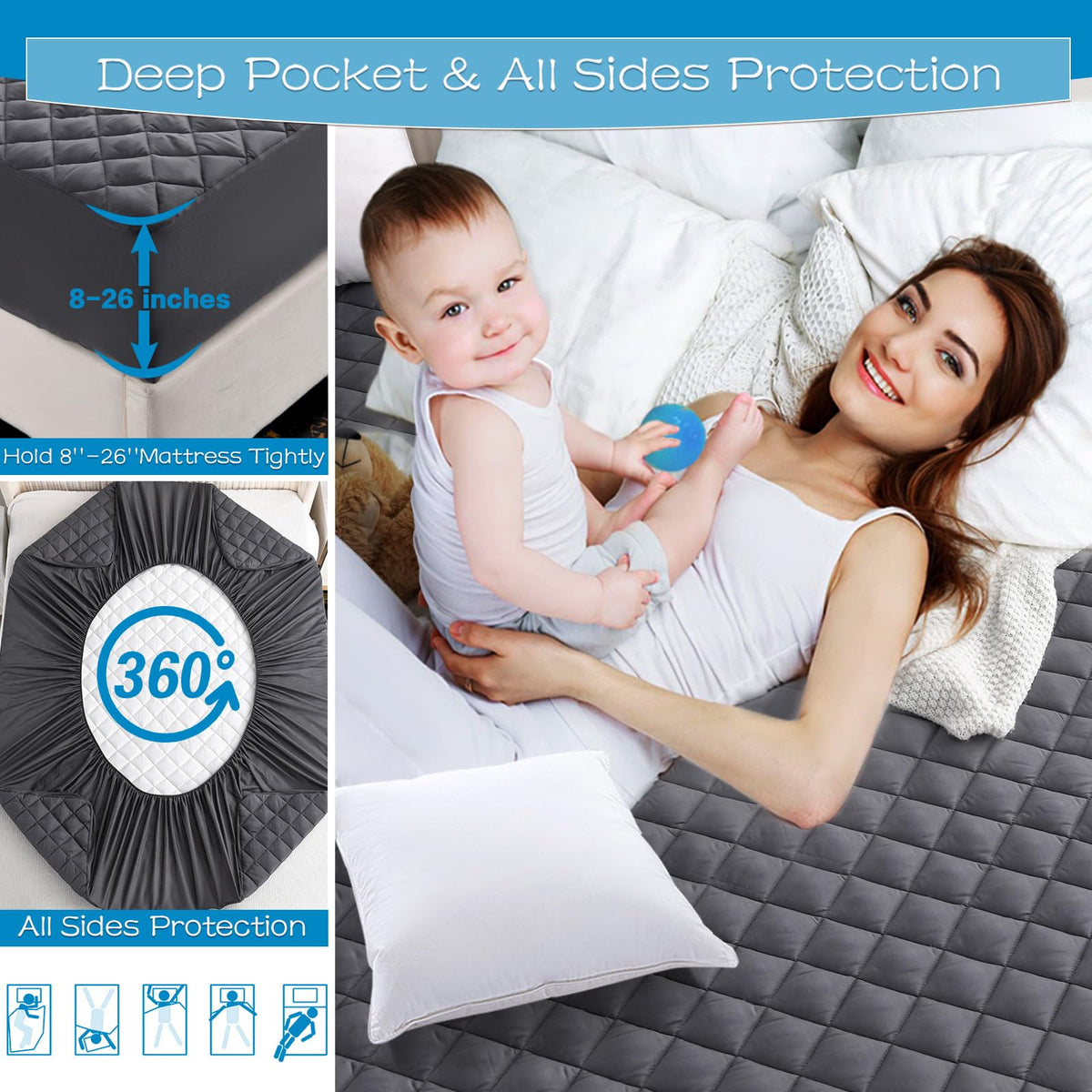 Waterproof Queen Size Grey Quilted Fitted Mattress Pad