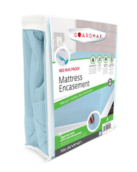 Guardmax Mattress Encasement Is A Waterproof And Bed Bug Barrier Mattress Encasement. The Guardmax Mattress Protector Comes In The Following Sizes; Queen, Short Queen, King, California King, Full, Full Xl, Twin, Twin Xl, Rv (48'' X 75''), And Cot (33'' X 75''), Crib, And Mini Crib. The Guardmax Mattress Cover Has A Durable And Air Tight Zipper Made Of Nylon To Ensure It Won'T Snap Or Trap Easily. It Is Currently Offered In The Following Colors; White, Blue, And Gray.