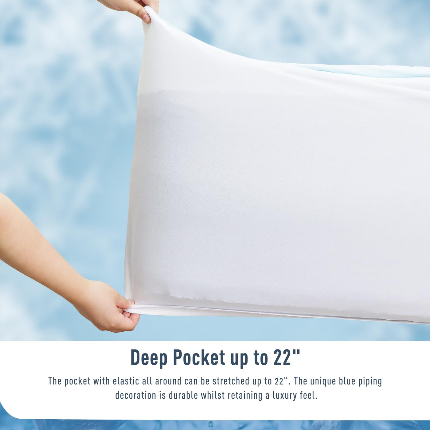 Our Cooling Mattress Protector Is Designed To Help You Stay Cool And Comfortable All Night Long. The Specially Designed Cool And Smooth Surface Helps Regulate Your Body Temperature, While Keeps You Dry And Comfortable. The Bottom Non-Woven Fabric Bottom Layer Provides Reliable Protection Against Spills And Stains. The Depth Of The Mattress Skirt Is 18'' And It Can Be Stretched Up To 22'', Which Fits Most Mattresses.
