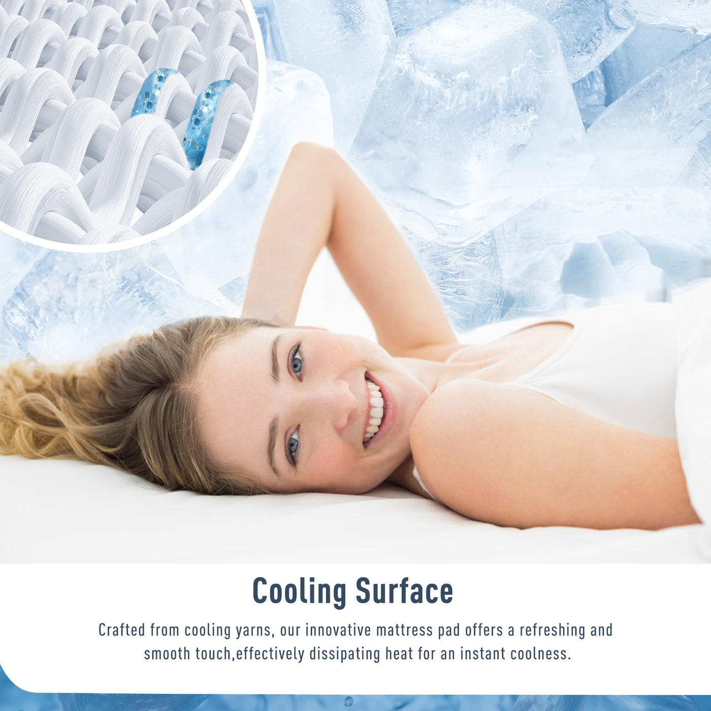 Q: How does the cooling technology work in this mattress pad?A: This mattress pad features Q-Max > 0.4 cooling technology, which helps regulate temperature and wick away moisture, keeping you cool and comfortable throughout the night, especially beneficial for hot sleepers.