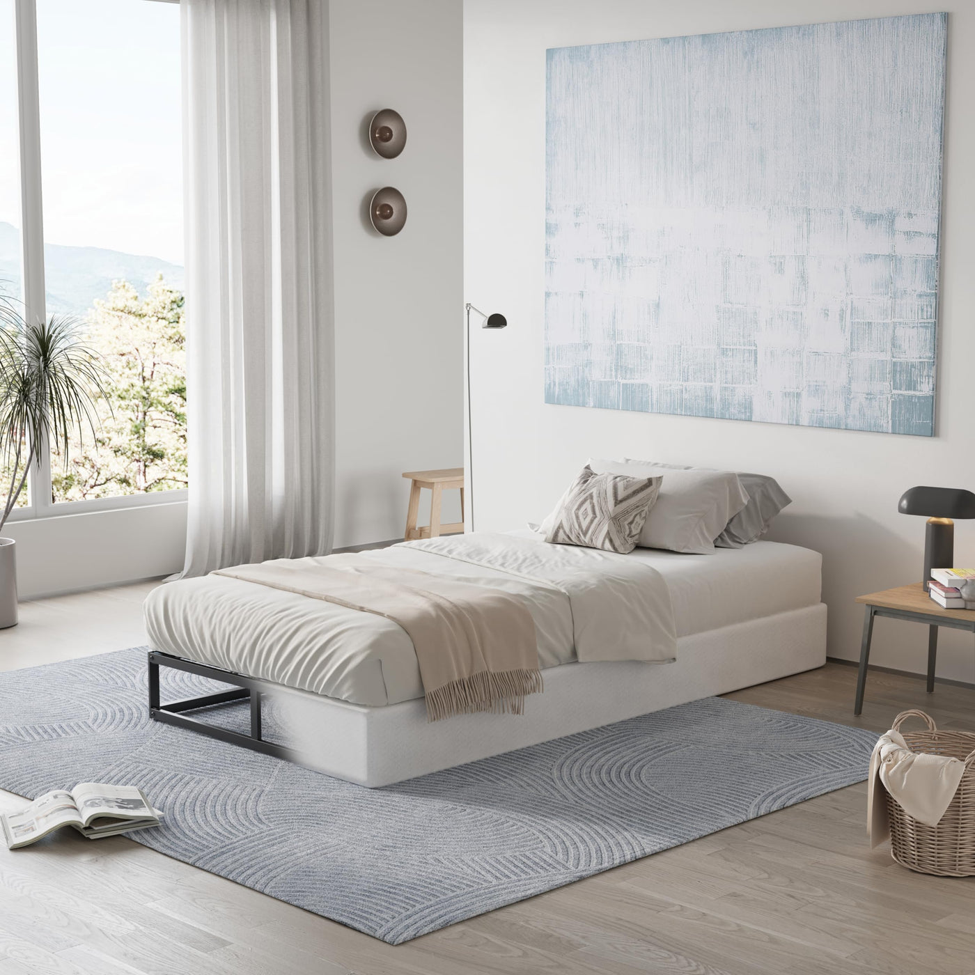 Q: What materials are used in the construction of the HUEIIS Box Spring?A: The HUEIIS Box Spring is constructed from a strong metal frame that provides durability and stability, along with a fabric cover for easy cleaning.