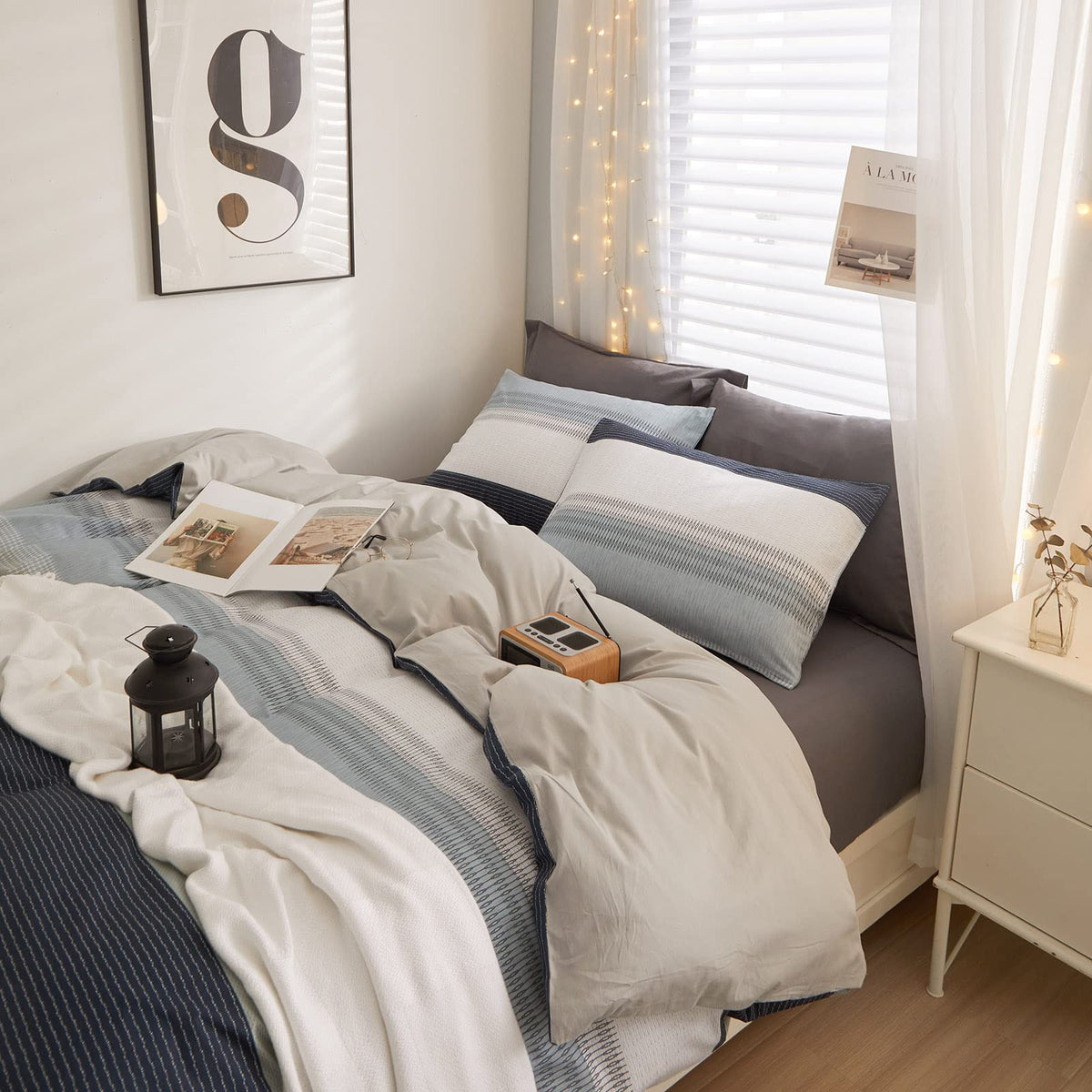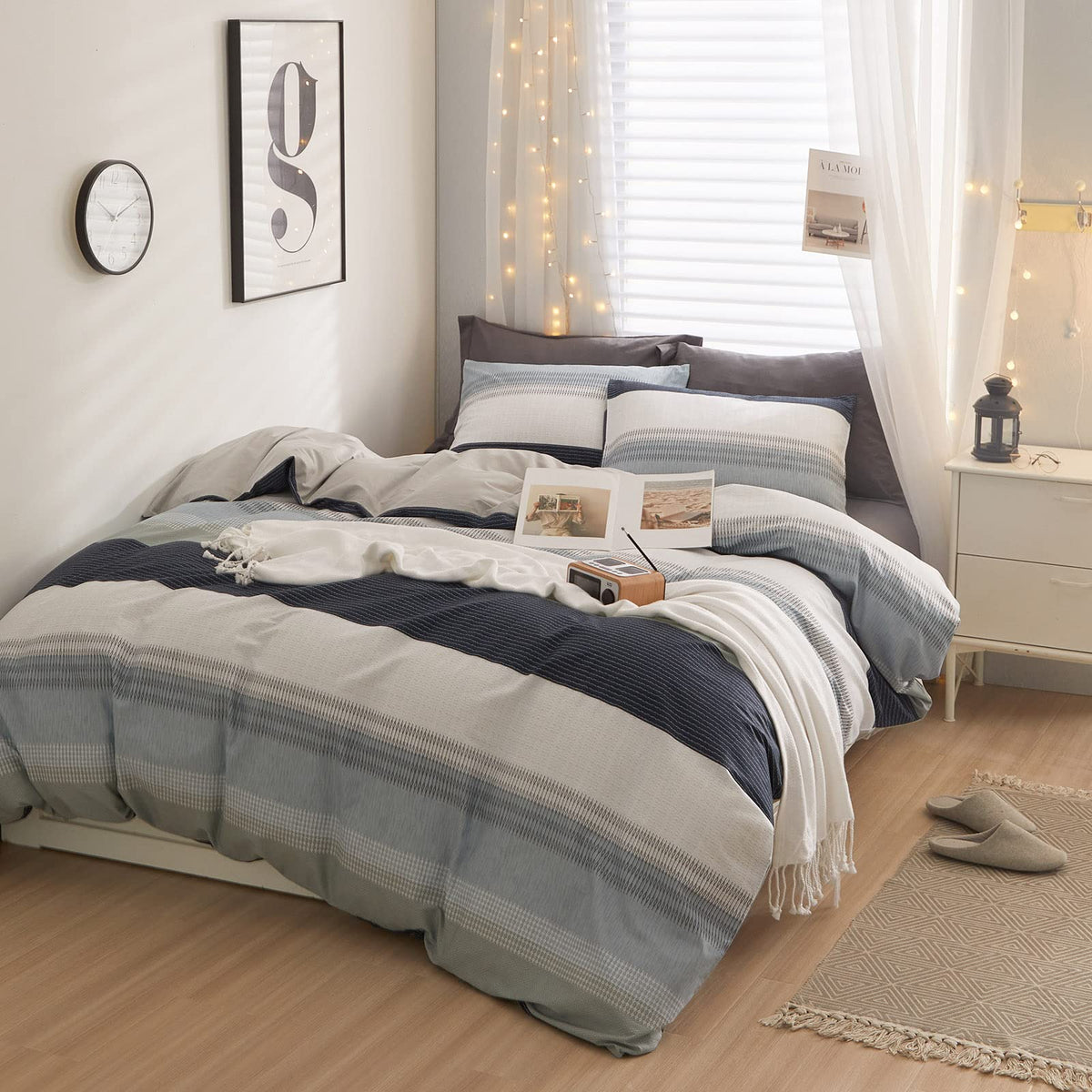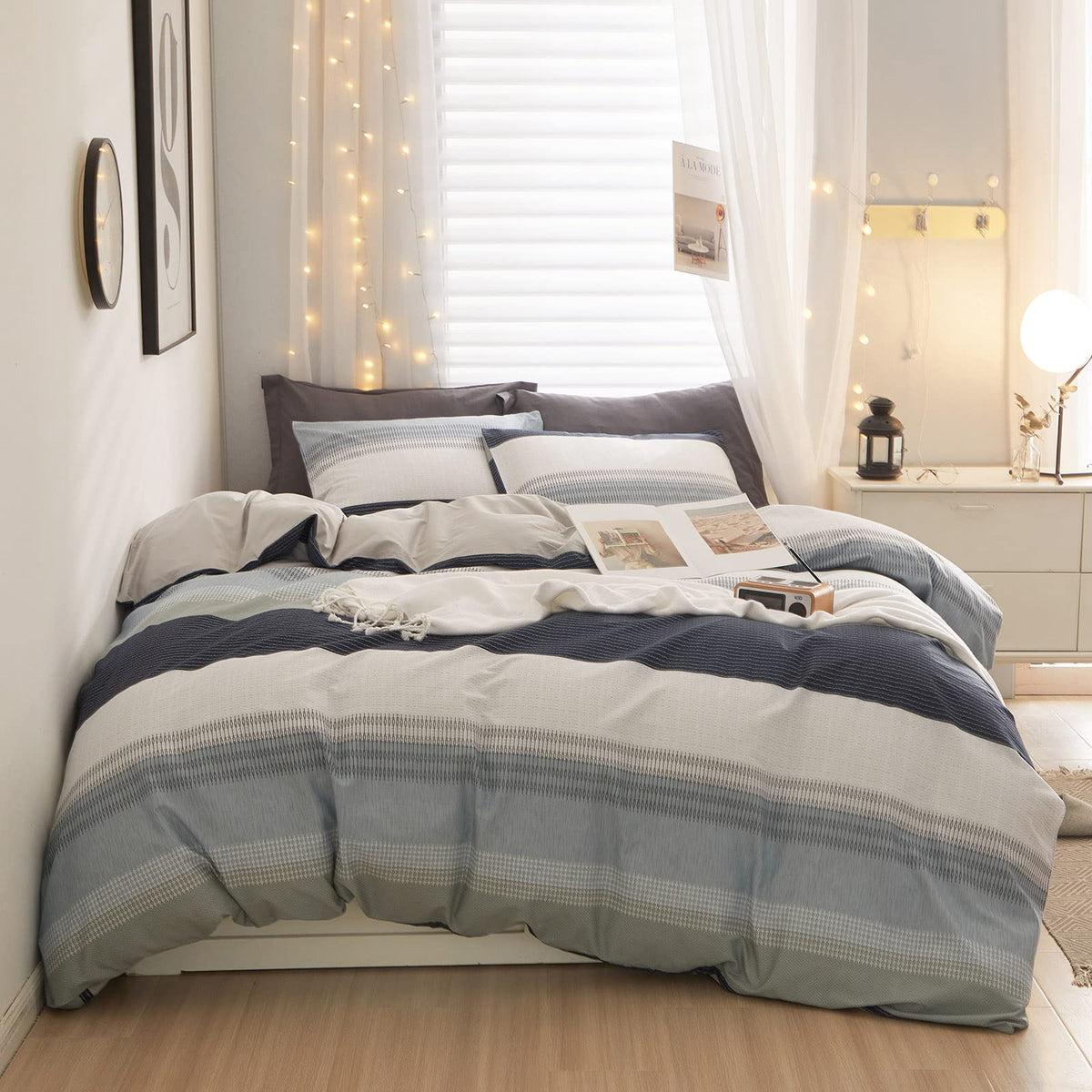Lifetb Cotton Stripe Duvet Cover Full Size Gray Blue White Stripe Comforter Cover Modern Style Geometric Stripe Bedding Set For