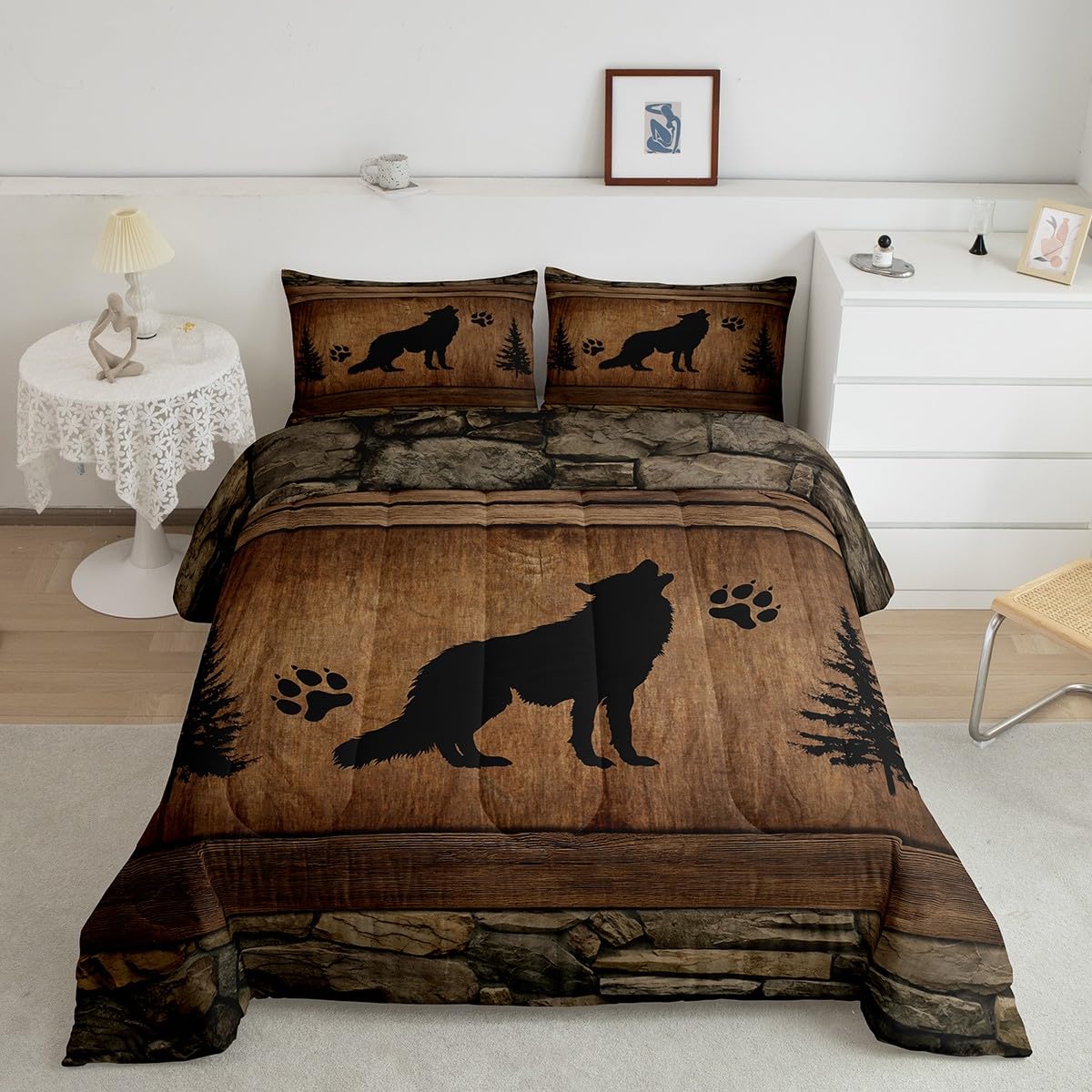 Manfei Wolf Kids Comforter Set Queen Size, Wild Animal Down Comforter, Rustic Farmhosue Brown Wooden Plank Bedding Set For Boys