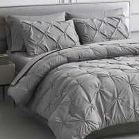Q: What makes the design of this comforter set unique?A: The comforter set features an elegant pinch pleat design that adds a sophisticated, textured look to your bedroom decor, enhancing its overall style and aesthetic.