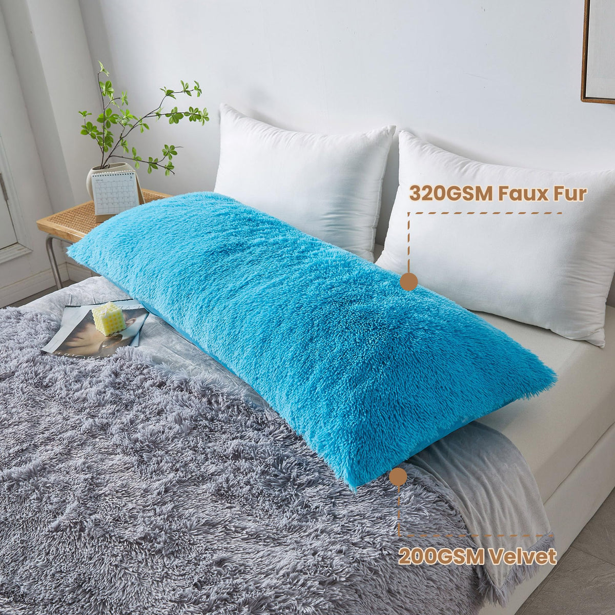 Q: What materials are used in the MEGO Luxury Fluffy Body Pillow Cover?A: The MEGO Luxury Fluffy Body Pillow Cover is made from high-quality microfiber with luxurious 45mm fluffy long fur on one side and ultra-soft, skin-friendly velvet on the reverse side.