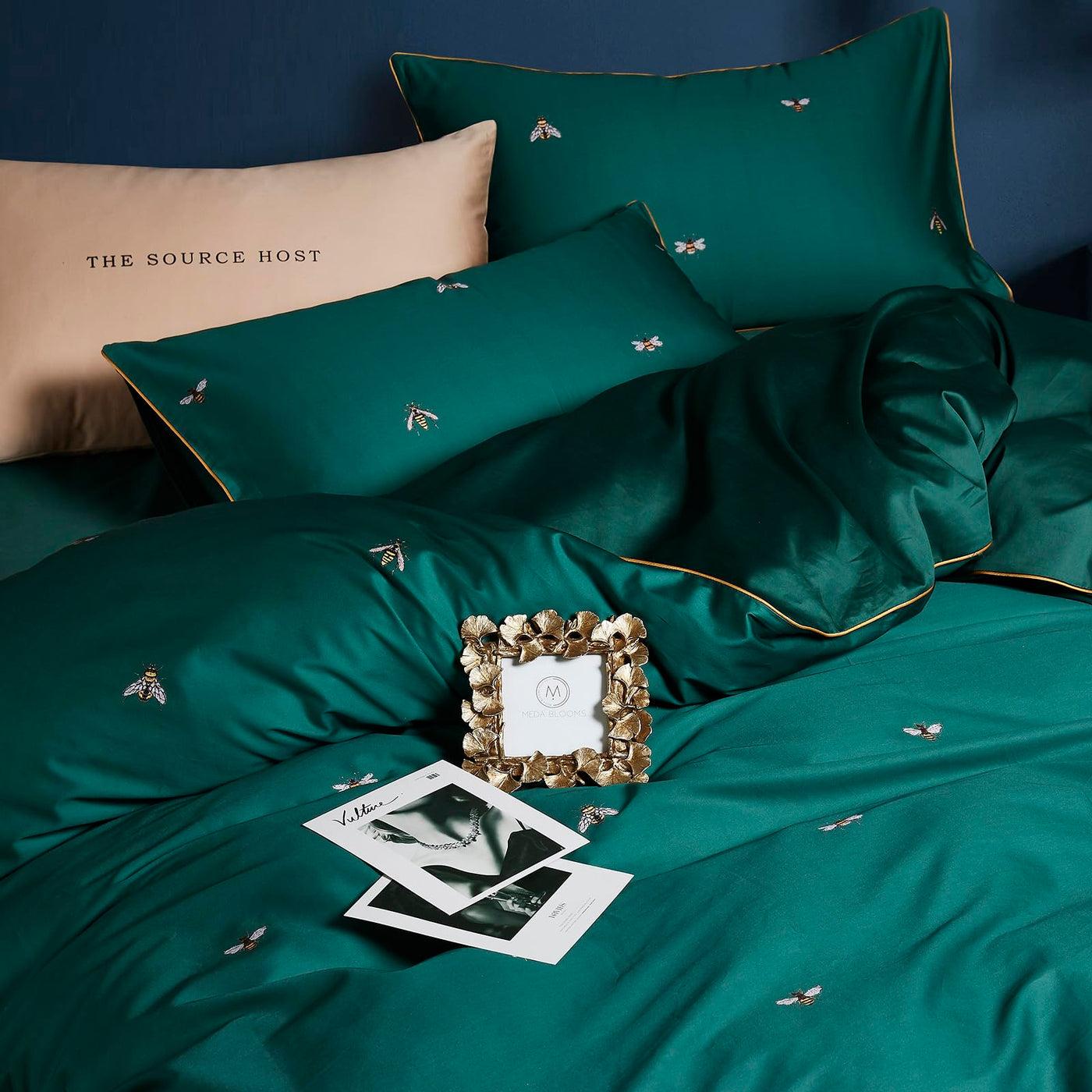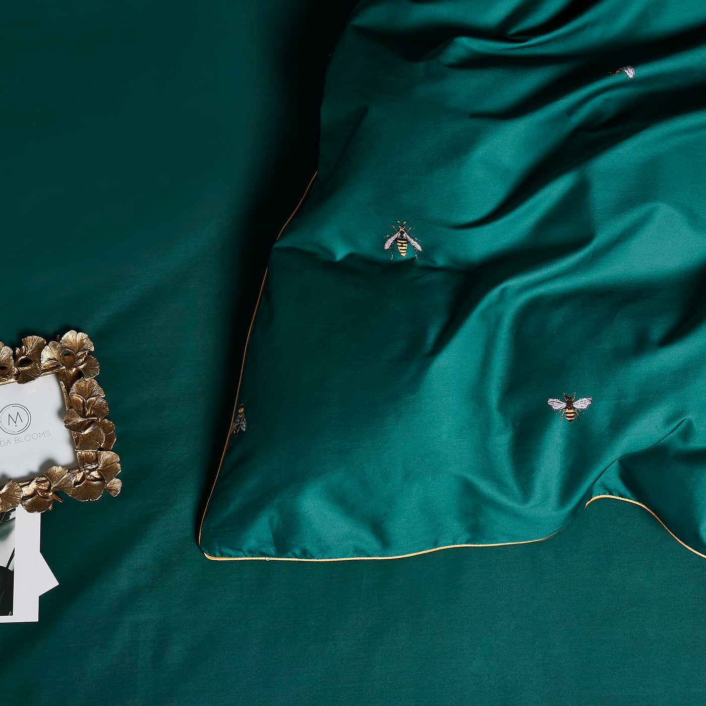 Mixinni Dark Green Duvet Cover King Size, 100% Long Staple Cotton Honeybee Floral Pattern 3Pc Bedding Duvet Cover Set With Zippe