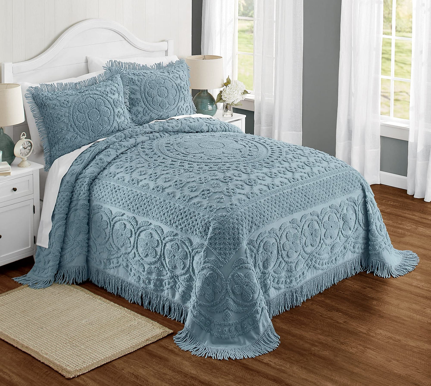 Montgomery Ward Emily Floral Chenille Bedspread, Soft Cotton Comforter, California King Size Quilt In Blue - Luxury Hotel Beddin