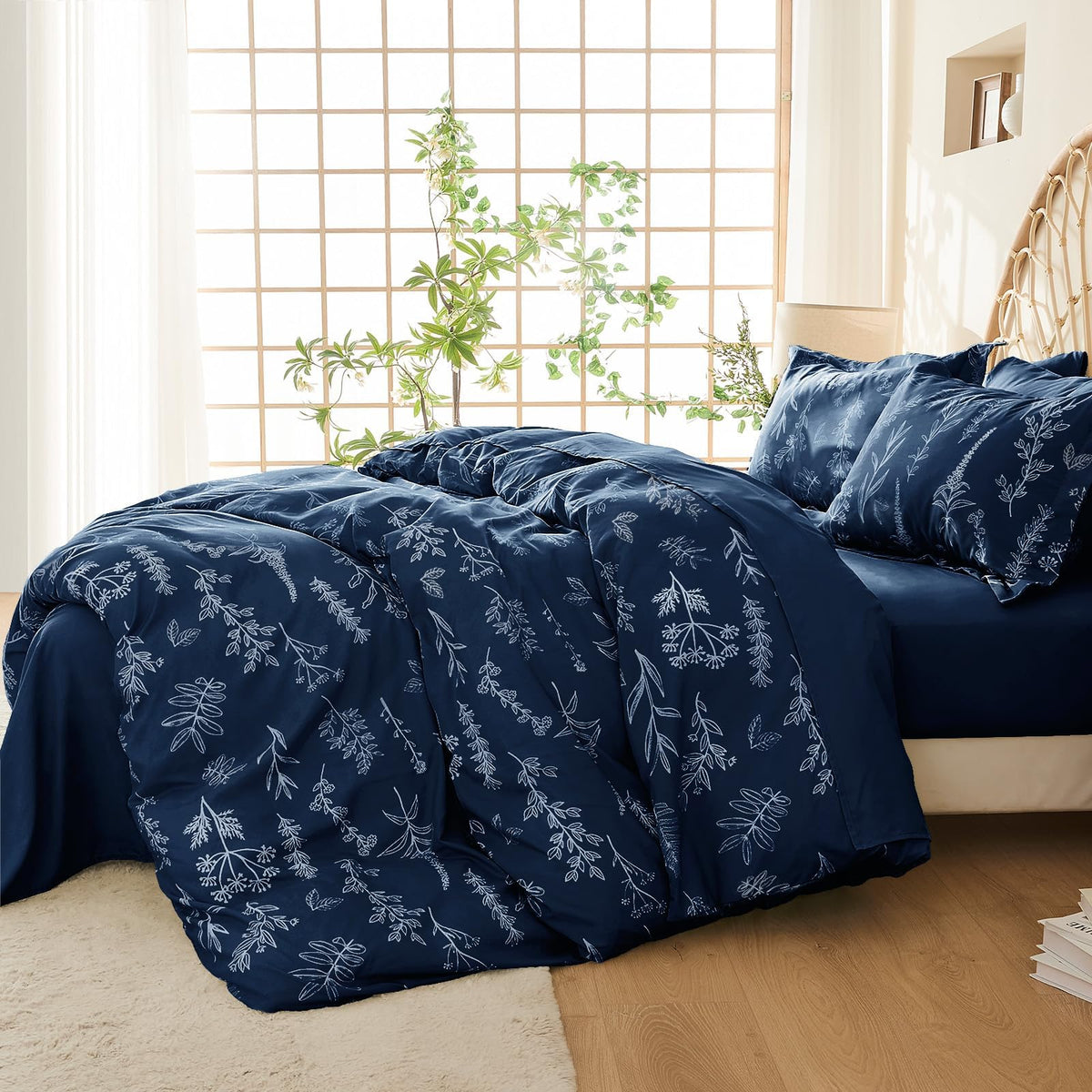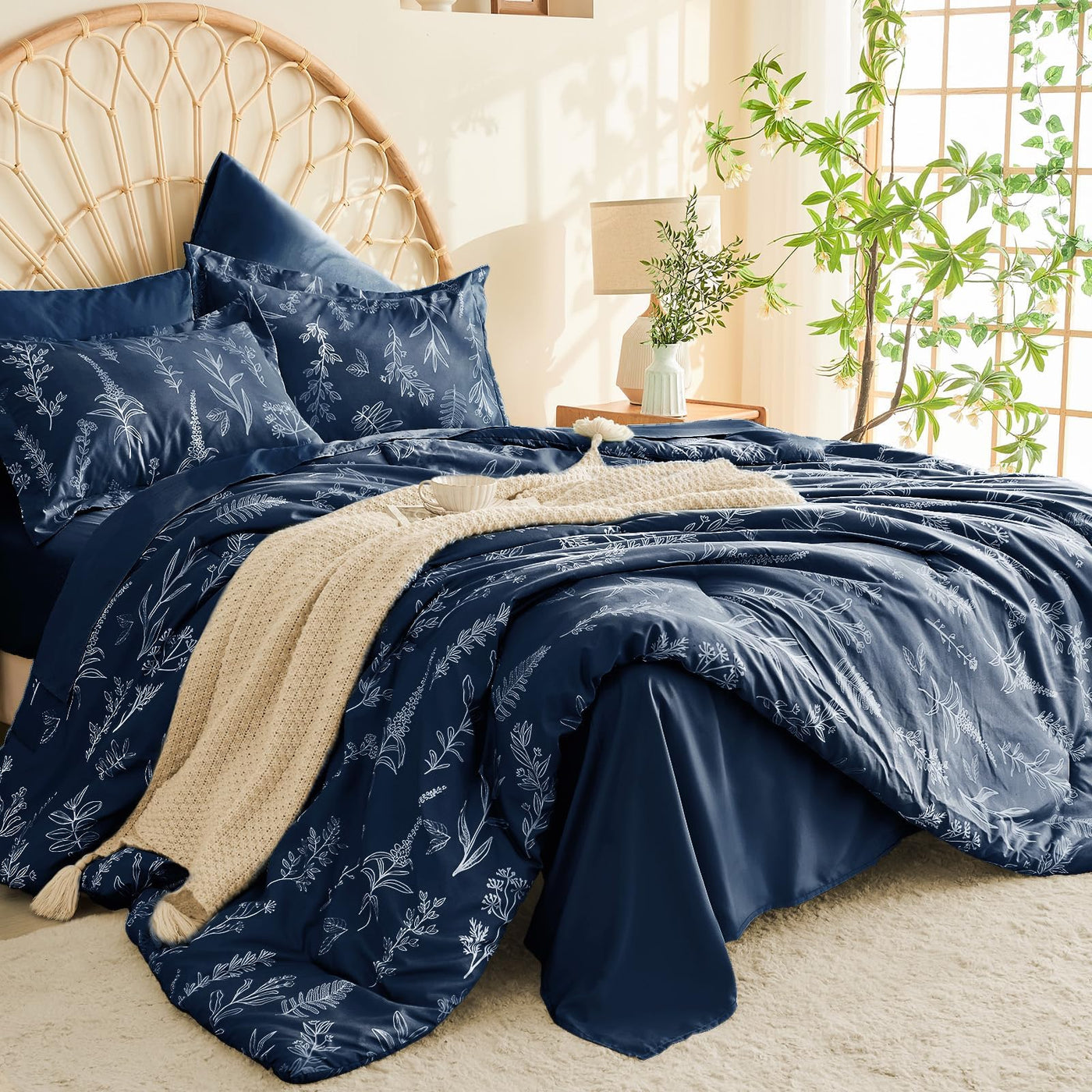 Muxhomo Navy Blue Bed In A Bag Queen 7 Pieces, Queen Comforter Set Reversible Botanical Flowers Design, Ultra Soft & Breathable