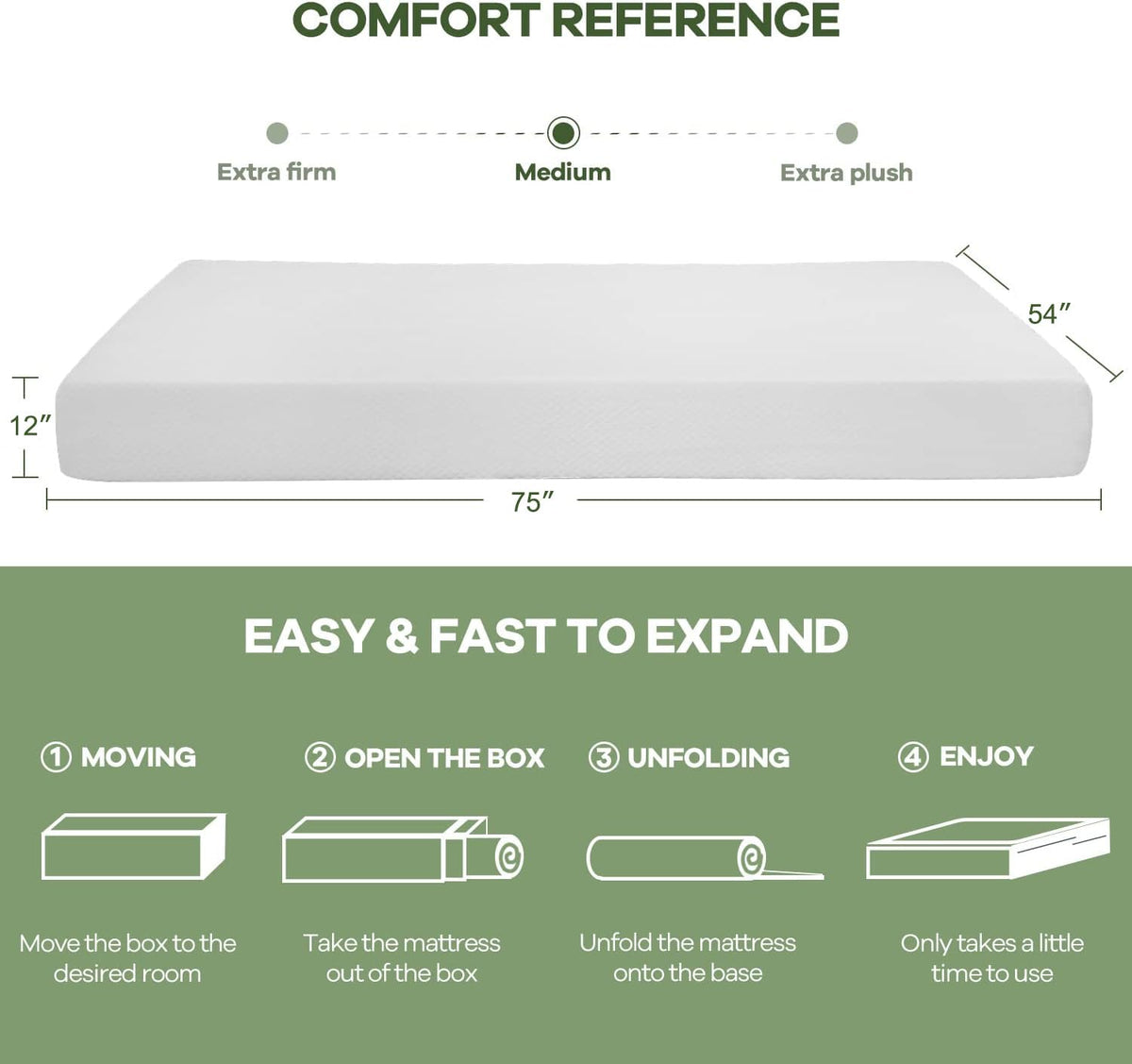 Q: How does the mattress come packaged, and how long does it take to expand?A: The NChanmar mattress is vacuum sealed and rolled in a box for easy transportation. After unpacking, it will inflate in about 10 seconds, but it is recommended to allow up to 72 hours for it to fully expand to its original size.