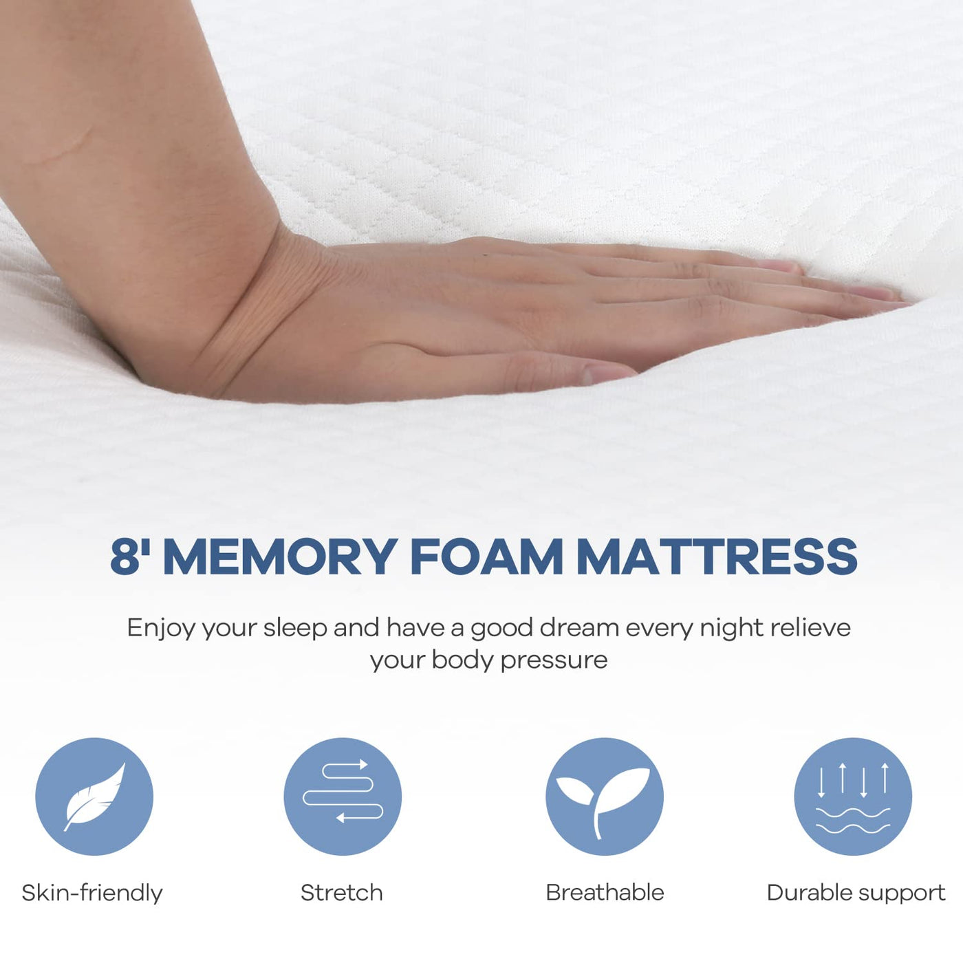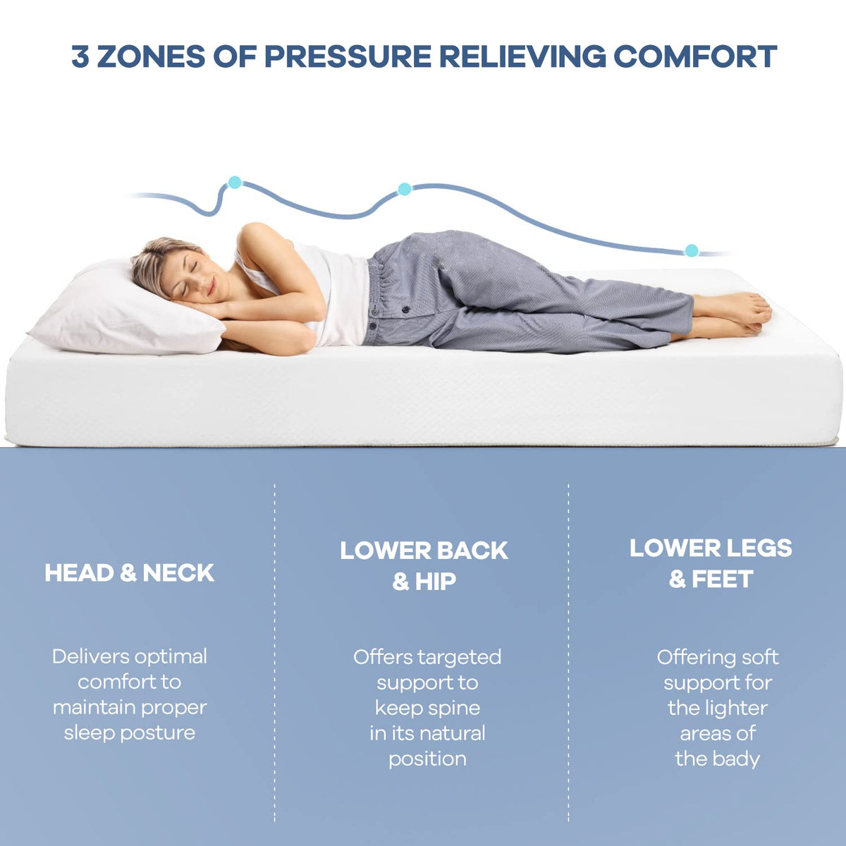 Q: How does the mattress provide pressure relief?A: The mattress utilizes buoyant, no-sink support foams that adapt and conform to your body, offering optimal pressure relief for a comfortable sleeping experience.