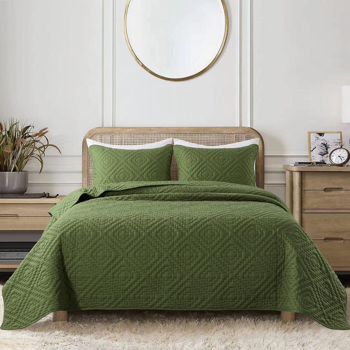 Olive Green Queen Size Quilt Bedding Sets With Pillow Shams, Boho Dark Sage Lightweight Soft Bedspread Coverlet, Quilted Blanket