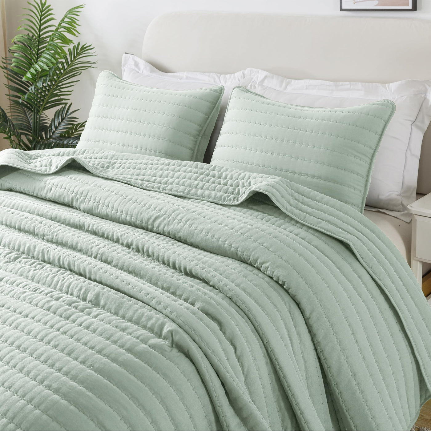 Roaringwild Sage Green Queen Size Quilt Bedding Sets With 2 Pillow Shams, Full Lightweight Soft Bedspread Coverlet, Quilted Blanket Thin Comforter Bed Cover For All Season, 3 Pieces, 90X90 Inches