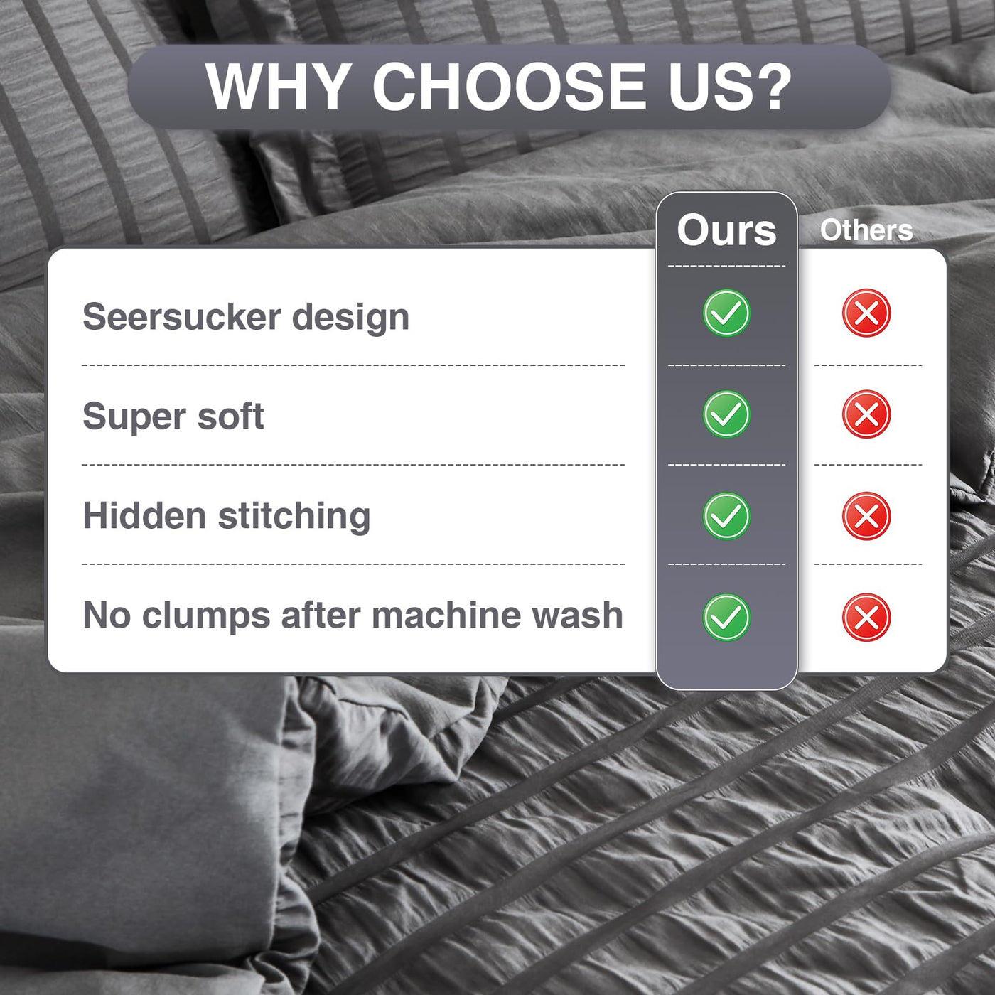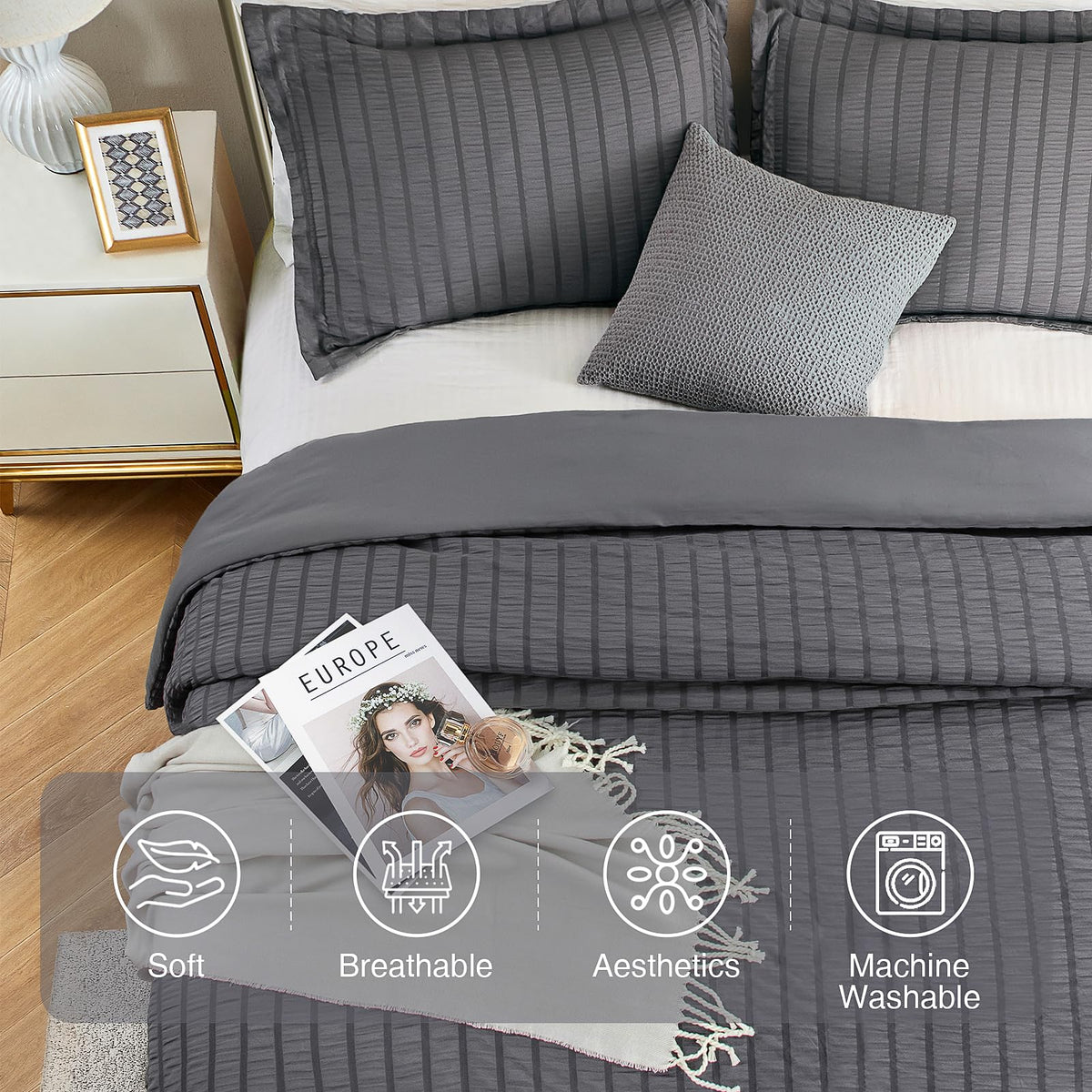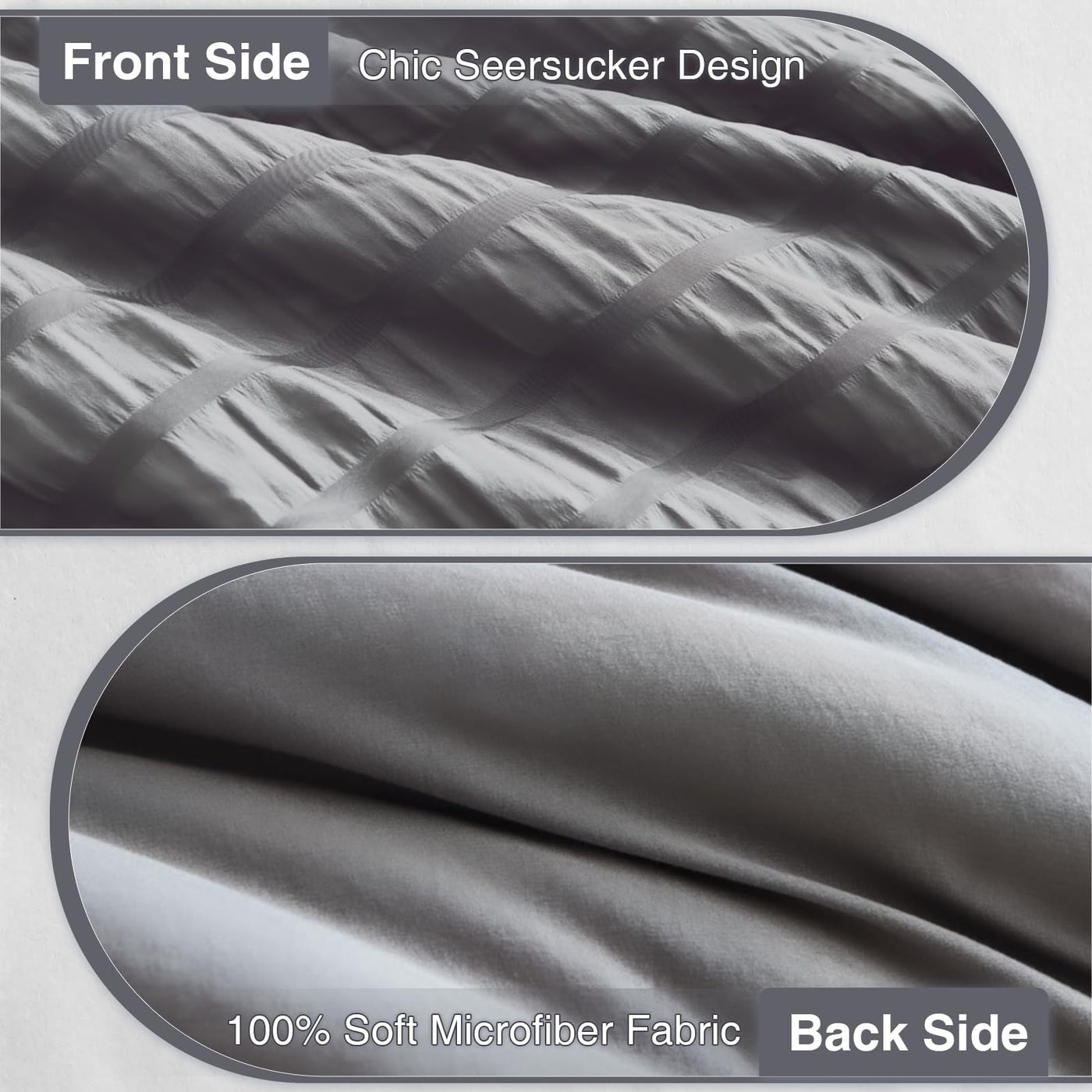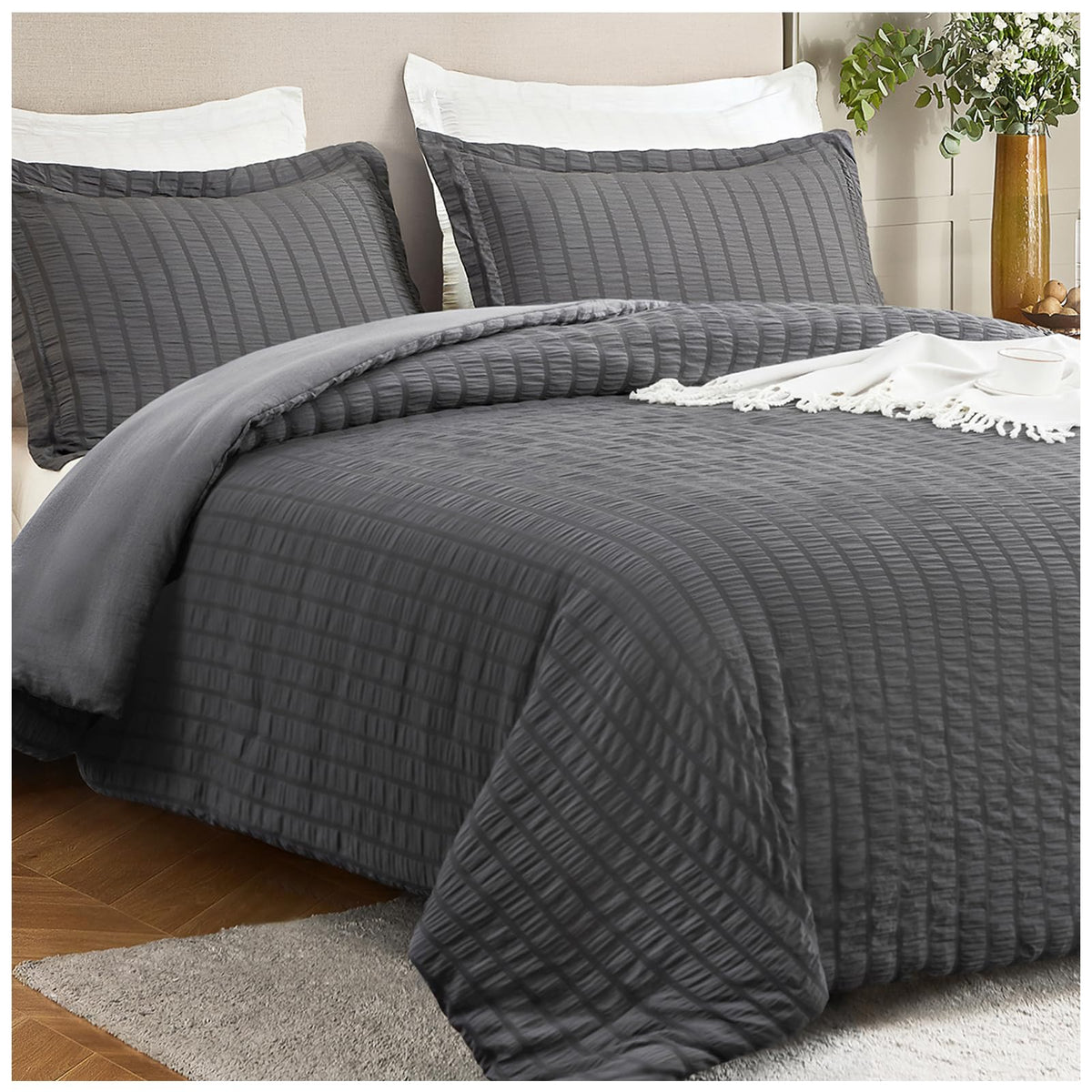 Satisomnia Queen Comforter Set Grey, Soft Seersucker Comforters Queen Size Bed, 3 Pieces Lightweight Down Alternative Bedding Co