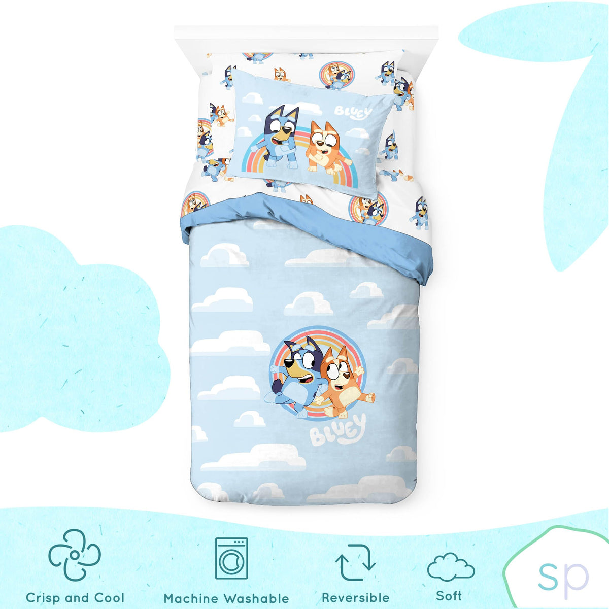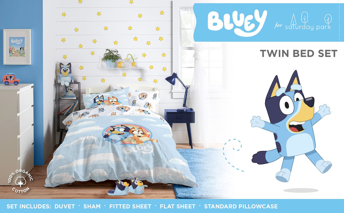 You'Ll Always Be Dreaming With Our Bluey And Bingo Rainbow In The Clouds Twin Bed Set! Made Of 100% Gots Certified Organic Cotton And Oeko-Tex Certified, You Can Sleep Well Knowing Our Bed Sets Have Been Tested For Over 300 Harmful Chemicals And Synthetics. Our Bed Sets Are Composed Of Durable, Long-Staple Cotton With A Crisp Percale Weave That Gradually Softens Over Time. Five Piece Bed Set Includes One Duvet Cover, One Fitted Sheet, One Flat Sheet, One Pillowcase, And One Sham (Duvet Insert Not Included). To Clean Machine Wash Cold. To Dry, Air Dry Or Tumble Dry On Low.