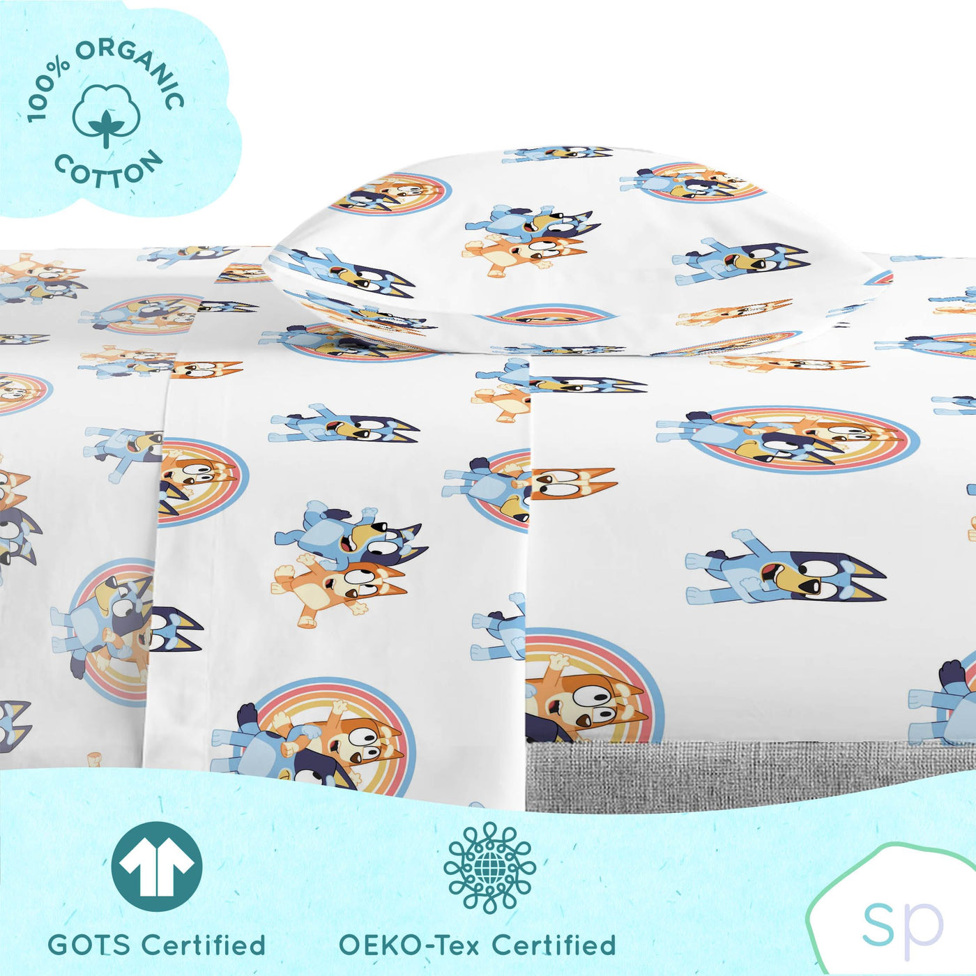 Q: What materials are used in the Saturday Park Bluey and Bingo Rainbow Clouds Twin Bed Set?A: The bed set is made of 100% GOTS certified organic cotton, ensuring a soft and breathable fabric that is safe for your child and free from harmful chemicals.