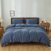 Q: What materials are used in the Simple&Opulence duvet cover set?A: The Simple&Opulence duvet cover set is made from 100% natural French linen, which is known for its breathability and comfort. This material effectively regulates body temperature and humidity, providing a cozy sleeping experience year-round.