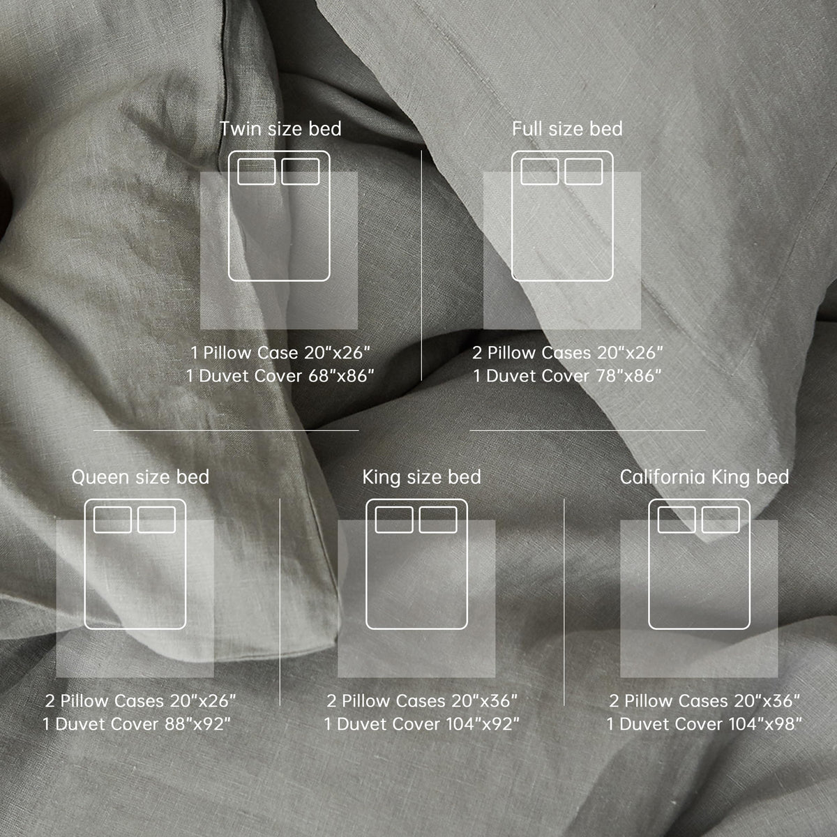 Material: 100% French Linencolor: Linen, White, Sage Green, Light Dusty Blue, Blush Pink,Classic Blue, Light Grey, Sand, Dark Grey, Rust, Olive Green, Ultimate Grey, Mustard Yellow, Lilac, Purple, Classic Bluesize: Duvet Cover (104'' X 90''), Pillowcases (20'' X 36'')Package Includes: Linen Duvet Cover Setfeatures:~We Select French Natural Linen Materials, Which Are Delicate, Soft And Breathable, Ultimate Grey Comforter Cover Full Will Bringing You The Dual Enjoyment Of Nature And Luxury In Your Sleeping Environment.~The Fall Duvet Cover King Size Is Specially Designed With 4 Inner Corner Ties, Plus A Sophisticated Hidden Button Closure System To Ensure That The Quilt Core Is Firmly Fixed To Prevent The Filling From Shifting, And Keep The Bed Flat And Comfortable Even In Deep Sleep.~The Overall Design Is Simple Yet Elegant. The Pure Linen Fabric Can Be Perfectly Integrated With Any Style Of Bedroom Decoration, Adding A Touch Of Low-Key Luxury To Your Private Space.~We Know That A Good Sleeping Experience Comes From Every Tiny Detail, So Each Bed Set Of Linen Duvet Cover King Is Delivered With 2 Spare Buttons To Ensure That You Can Enjoy Comfort Without Worrying About Unexpected Inconveniences.~Whether It Is For Personal Use Or As A Gift To Relatives And Friends, This 3-Piece Linen Bedding Set King Size Conveys A Persistence And Pursuit Of Quality Of Life. It Is Not Only Bedding, But Also A Display Of A Life Attitude. Let Us Immerse Ourselves In This Natural Gift From The French Countryside And Feel The Gentle Embrace Of Every Dream.Please Notes:1.Manual Measurement, Please Allow Slight Errors On Size.2.Different Colors Under Light:We Have Comfy European King Size Duvert Cover Set Of 3 In Various Colors For You To Choose From. At The Same Time, The Colors Displayed Under Different Lighting, Display Settings Or Resolutions Will Be Slightly Different.