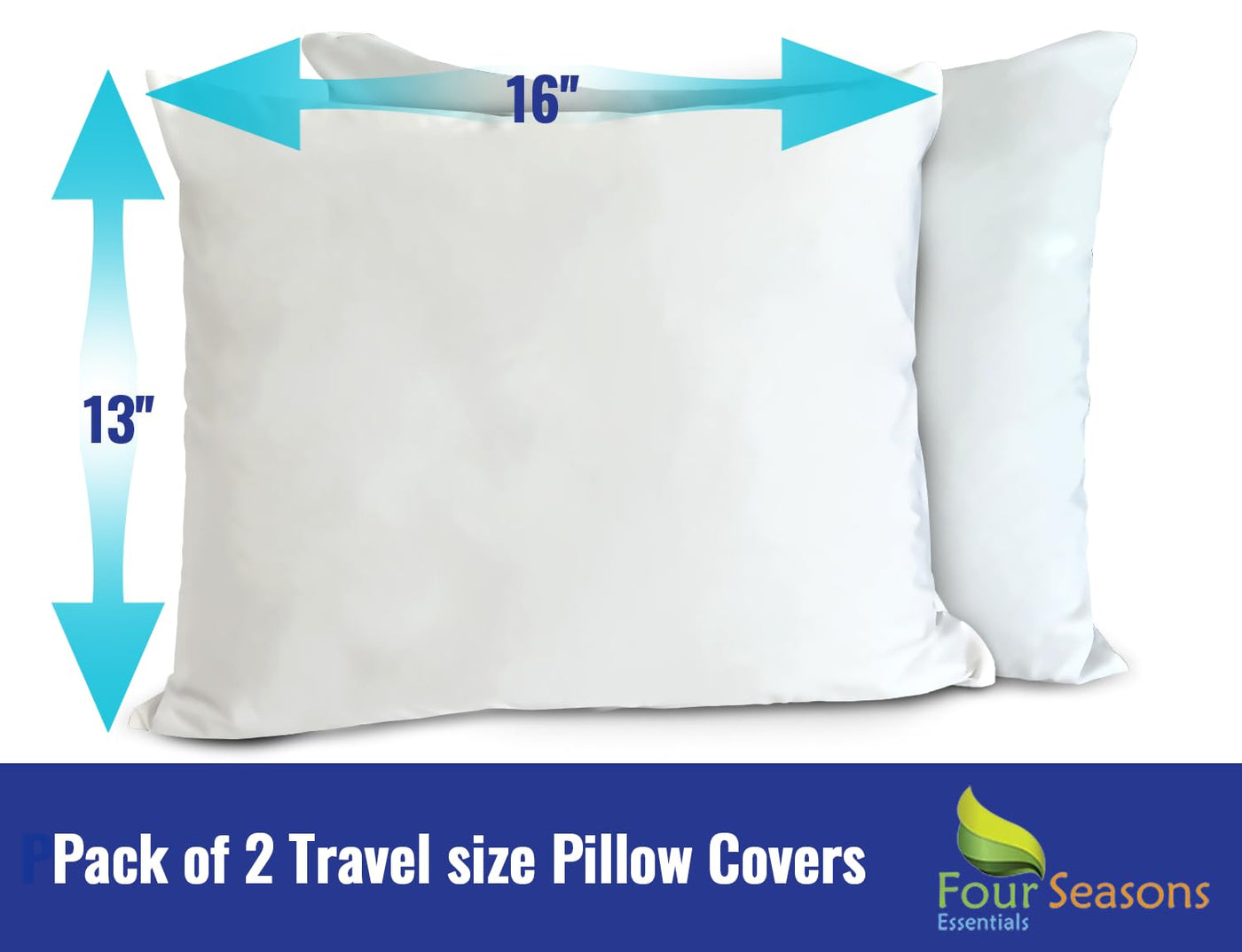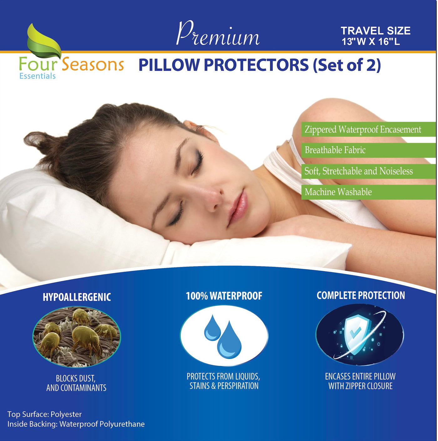 Premium Quality Travel Size Pillowcase Encasement By Four Seasons Essentials! Protect Your Pillow From Fluids, Perspiration, Stains And Protect Yourself From Allergies! - Set Of 2 Travel Size Zippered Pillow Protectors - Breathable Membrane Will Allow Air To Circulate Yet Repel Liquids. Smooth And Noiseless Fabric For A Cool Comfortable Night'S Sleep -100% Waterproof - Recommended If You Are Suffering From Allergies, Eczema Or Asthma - Machine Washable; Easy To Remove And Wash -Keeps Pillow Feathers From Poking Out -Top Surface: 100% Polyester; Inside Backing: 100% Polyurethanewashing Instructions: Machine Wash Warm. Rinse Cold. Wash Encasement Alone For Best Results. After Washing Flip The Encasement Inside Out So The Waterproof Backing Faces Out And Run The Machine For An Extra Spin Cycle. Drying Instructions: Tumble Dry On Low Heat Only To Line Dry. For Faster Drying, Add A Large Dry Towel.
