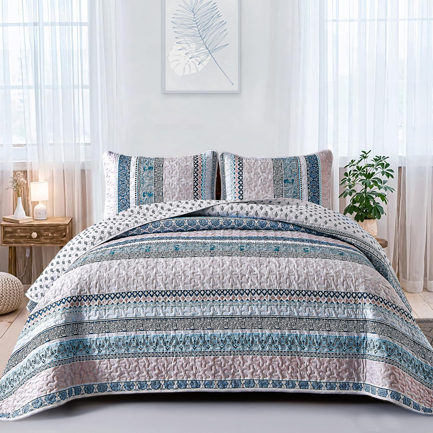 Q: What makes this quilt set unique compared to others?A: The WONGS BEDDING Boho Quilt Set features a vibrant bohemian pattern with exquisite stitching, providing a unique, coordinated look for your bedroom. Its lightweight design ensures comfort, while the high-quality microfiber material enhances durability.