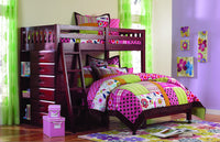 This ready-to-assemble unit in a rich merlot finish features a twin over full bunk bed with a six-drawer storage unit and four built in shelves for storage. A full length ladder provides easy access to the twin top bunk. Quality and solid wood construction makes this bed a great buy.