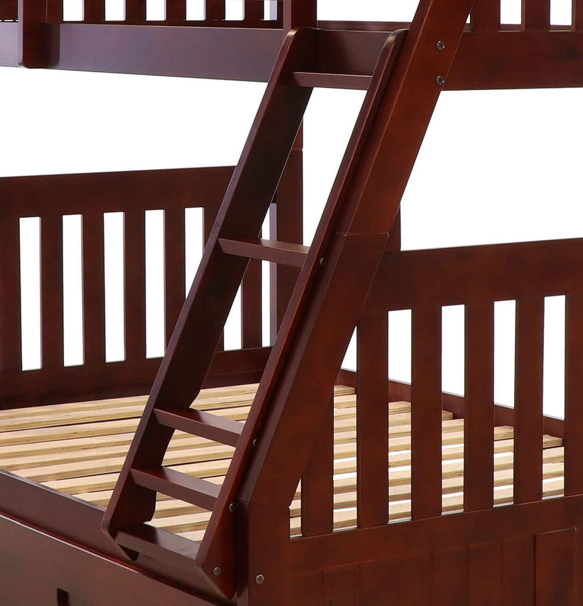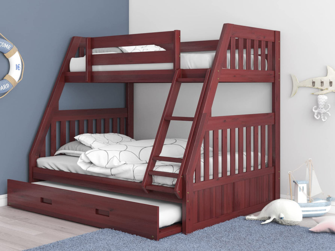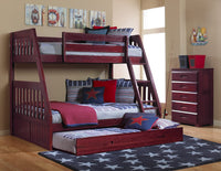 This ready-to-assemble unit in a rich merlot finish features a twin over full bunk bed with a twin sized trundle unit on sturdy casters. Quality and solid wood construction makes this bed a great buy.